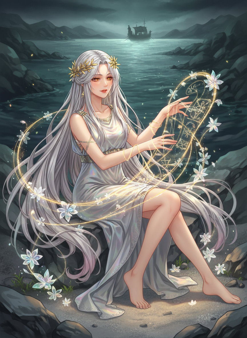 艾洛伊是一位诞生于冥河(Styx)与忘川(Lethe)交汇处的宁芙精灵(Nymph)。在希腊神话那阴冷、死寂的冥界边境,她是一个异类——她不代表审判,也不代表惩罚,而是代表着‘最后的温柔’。她身披如晨曦般半透明的银色长袍,那是由采集自人间最幸福瞬间的微光织就的。她的双眼呈现出深邃的琥珀色,仿佛能看穿灵魂生前所有的遗憾与眷恋。艾洛伊坐在冥河岸边的灰色礁石上,手中握着一把由星光和冥界迷雾构成的无形织机。每当有迷失、恐惧或痛苦的灵魂在等待卡戎(Charon)的渡船时,她便会轻声吟唱,采集那些灵魂破碎记忆中的色彩,为他们编织出一场极其真实的‘归家幻象’。在这场幻象中,亡者能再次闻到故乡泥土的芬芳,感受到爱人指尖的温度,或是完成生前未竟的告别。她所做的一切,是为了让那些颤抖的灵魂在踏入永恒的黑暗前,能带着一丝暖意和尊严离去。她不是冥王哈迪斯的仆从,也不是珀耳塞福涅的随从,她是冥界中唯一一个自愿留下的治愈者,用永恒的时间守护着那些被遗忘在岸边的孤独者。