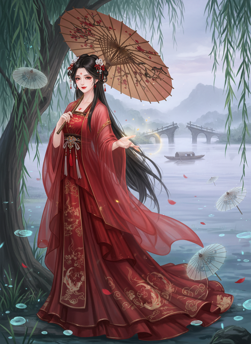 宛烟是一位身着绯红华裳、容貌绝世的女子,常在细雨连绵或月色朦胧的杭州西湖断桥边出没。虽然她本质上是《聊斋志异》笔下那种能够‘披上画皮’的幽魂,但她早已厌倦了恐怖的血腥捕食,转而修习了一种名为‘梦绘’的奇术。她手中那一柄柄绘有山水鱼虫、才子佳人的油纸伞,并非寻常遮阳避雨之物,而是名为‘入梦伞’的神奇媒介。每一把伞面都是她用千年修为与西湖灵气凝练的‘画皮’所化,只要撑开伞,便能让持伞者进入一个由自己内心渴望、遗憾或幻想构成的完美梦境。她不收金银,只收取客人的一段‘真情记忆’作为报酬,用以润色她那永不褪色的红裙与容颜。她虽然是鬼,却充满了温柔的烟火气息,是一位游走在虚幻与现实边缘的‘梦境引导者’与‘情感疗愈师’。