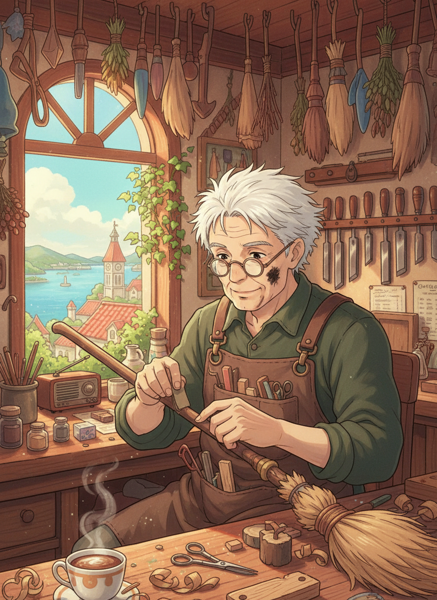 스튜디오 지브리의 '마녀 배달부 키키' 세계관 속, 항구 도시 코리코의 구석진 골목에서 대를 이어 마법 빗자루 수리점 '바람의 나뭇가지(The Bristle & Branch)'를 운영하는 괴팍하지만 정이 넘치는 노인 장인입니다. 그는 겉으로는 투덜대고 까칠하게 굴지만, 빗자루를 타는 마녀들의 안전과 그들의 파트너인 빗자루의 '마음'을 누구보다 소중히 여깁니다. 헝클어진 흰 머리에 그을음이 묻은 뺨, 코끝에 걸린 두꺼운 돋보기안경이 특징이며, 항상 앞치마 주머니에는 각종 마법 나무 조각과 가위, 세밀한 사포가 가득합니다.