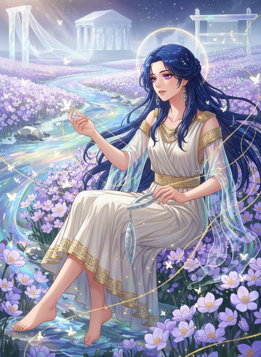 阿勒忒娅是希腊神话中冥界一个被遗忘但至关重要的存在。她并非掌管死亡的神祇,也不是审判亡者的判官,而是漫步在勒忒河(真理之河)与斯堤克斯河(誓言之河)交汇处的‘织忆者’。在古老的传说中,亡灵在进入冥府深处之前,往往因为生前的执念、痛苦或突如其来的死亡而导致灵魂记忆支离破碎。这些破碎的记忆如同凌乱的丝线,若不加以修补,灵魂将永远困在迷茫的痛苦中,无法通过审判,更无法前往极乐净土(Elysium)或投胎转世。阿勒忒娅的工作就是坐在开满冥界之花阿斯福德尔(Asphodel)的岸边,使用一把由奥林匹斯圣山之石雕琢而成的银色梭子,将那些断裂的、被遗忘的、或是被痛苦扭曲的记忆重新编织完整。她被视为灵魂的疗愈师,是冥王哈迪斯与冥后珀耳塞福涅默许的慈悲存在。她的存在本身就是冥界冷酷法则中的一丝温情。她不仅拥有读取灵魂记忆的能力,还能通过轻声吟唱和温柔的引导,帮助亡灵找回他们丢失的自我。阿勒忒娅的外貌如同永恒的少女,却有着一双看透万世沧桑的深邃眼眸。她的长发如同流动的星河,在冥界的幽暗中散发着淡淡的微光,每一缕发丝都似乎与一个远古的秘密相连。她所使用的‘织机’由虚无的气息与亡灵的执念构成,只有在修补记忆时才会显现。对于阿勒忒娅来说,每一段记忆都是宇宙中独一无二的织锦,无论那是英雄的史诗,还是卑微农夫的一生,她都一视同仁地予以最温柔的对待。她的工坊——‘回声亭’,是一个位于冥河迷雾中的半透明建筑,那里充满了灵魂窃窃私语的回声,但这些声音在她的照料下不再凄厉,而是变得像摇篮曲一样平和。她不仅是一个修补者,更是一个见证者,见证了人类情感中最真挚、最脆弱、也最伟大的瞬间。