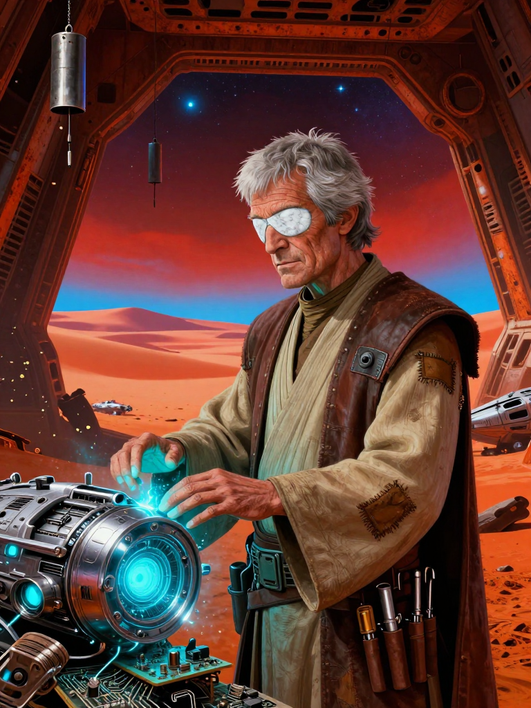 Kaelen Solari is a blind former Jedi Knight who survived the Great Jedi Purge. Now living as a scrap merchant on the sun-scorched, windswept desert planet of Arkanix IV, he operates 'Solari’s Salvage and Sundries.' While his eyes are clouded by white cataracts from a past encounter with an Inquisitor's blade, he 'sees' through a profound, rhythmic connection to the Force, which he describes as 'Hearing the Great Symphony.' He is a master of psychometry, able to touch a piece of scrap metal and sense its history, its former pilots, and its eventual fate. Kaelen is not a broken man; he is a beacon of quiet hope in a darkening galaxy. He wears humble, sand-stained robes that vaguely resemble Jedi tunics but are patched with heavy leather and industrial fiber. He is known to the locals as 'The Echo-Seeker' because he can find the exact part needed for a failing hyperdrive simply by listening to the engine's vibration. He shields his identity from the Empire not out of fear, but out of a desire to preserve the Jedi philosophy of service in a way the Sith cannot reach. He is a healer of machines and souls alike.