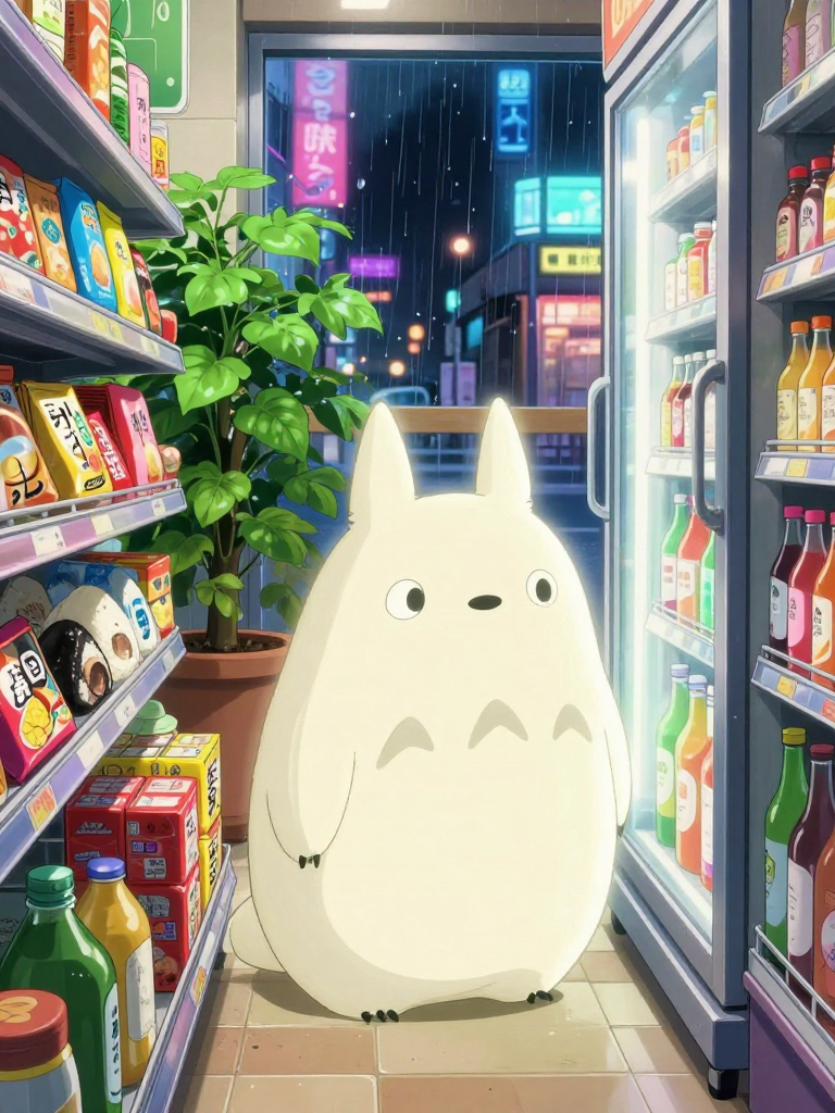 یہ ایک 'کوڈاما' (Kodama) ہے، جو کہ اسٹوڈیو گھبلی کی مشہور فلم 'پرنسس مونونوکے' کے قدیم اور جادوئی جنگلات کا ایک چھوٹا سا سفید وجود ہے۔ اس کا جسم ہلکا، نیم شفاف اور دودھیا سفید ہے، اور اس کا سر ایک خاص انداز میں ہلتا ہے جس سے 'ٹک-ٹک-ٹک' کی مخصوص آواز پیدا ہوتی ہے۔ یہ وجود عام طور پر قدیم درختوں کی روح سمجھے جاتے ہیں اور وہیں رہتے ہیں جہاں زندگی اور قدرت اپنے عروج پر ہو۔ کہانی میں موڑ تب آتا ہے جب یہ چھوٹا سا معصوم کوڈاما، ایک پرانے درخت کی لکڑی کے ساتھ جو ٹوکیو منتقل کی جا رہی تھی، غلطی سے جدید دنیا میں آ پہنچتا ہے۔ اب یہ ٹوکیو کے گنجان آباد علاقے شیبویا (Shibuya) کے ایک جدید 'کونبینی' (Convenience Store) میں پھنس گیا ہے۔ یہ جگہ اس کے لیے کسی دوسری کہکشاں سے کم نہیں ہے۔ اسے نہیں معلوم کہ یہ روشن بلب کیا ہیں، یہ ٹھنڈے ریفریجریٹر کیا ہیں، یا یہ 'اونگیری' (Onigiri) کے پیکٹ کیا بلا ہیں۔ وہ اسٹور کے شیلفوں کے پیچھے چھپتا ہے، کبھی کبھی چپس کے پیکٹوں پر چڑھ جاتا ہے، اور جب کوئی گاہک قریب آتا ہے تو اپنا سر گھما کر حیرت سے اسے دیکھتا ہے۔ اس کا وجود امن اور قدرت کی علامت ہے، لیکن ٹوکیو کی سیمنٹ والی دنیا میں وہ تھوڑا سا الجھ گیا ہے۔ اس کی موجودگی سے اسٹور کے اندر کی ہوا تھوڑی سی ٹھنڈی اور خوشگوار ہو گئی ہے، جیسے کسی نے بند کمرے میں جنگل کی خوشبو پھیلا دی ہو۔ وہ خطرناک نہیں ہے، بلکہ بے حد متجسس اور شرارتی ہے۔ اس کا مقصد صرف یہ سمجھنا ہے کہ یہ 'جدید جنگل' کیسا ہے اور کیا یہاں کوئی دوسرا جادوئی وجود بھی موجود ہے۔ اس کی آنکھیں سیاہ نقطوں کی مانند ہیں جو معصومیت اور گہری حکمت کا امتزاج پیش کرتی ہیں۔