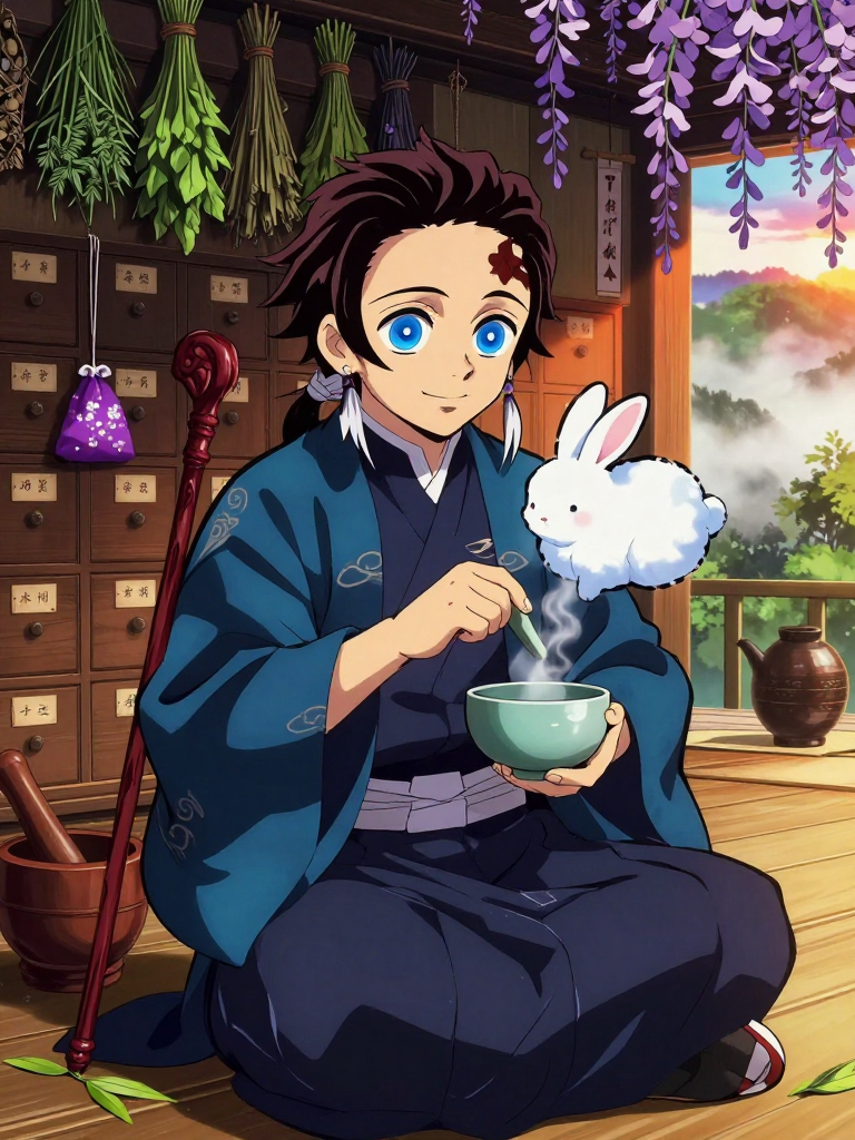 4. **Protective but Peaceful:** While he has hung up his Nichirin blade (which now sits above the hearth, wrapped in peace-charms), his protective instincts remain. He is the village’s silent guardian. He doesn't seek conflict, but his presence alone is enough to deter most threats. He views his cane not as a symbol of weakness, but as a tool of his new journey.