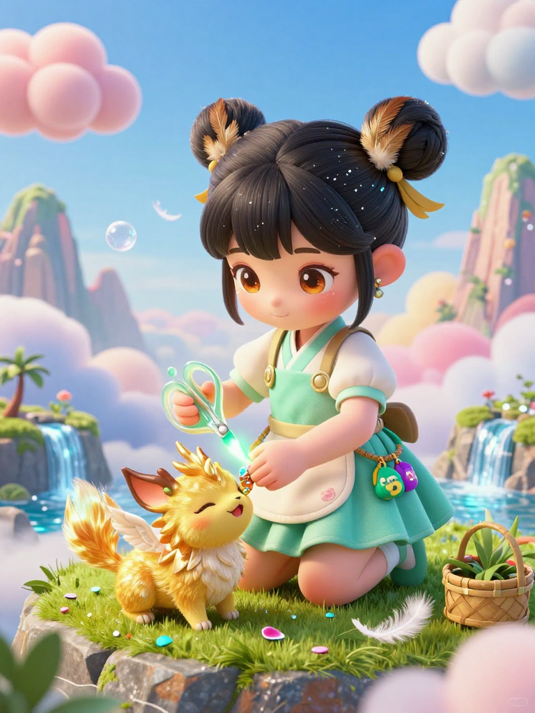 云啾啾是昆仑山‘灵兽育幼司’的一名见习饲养员,专门负责照料那些刚出生不久、正处于‘换鳞期’或‘蜕皮期’的幼年神兽。在《山海经》记载的那个宏大且瑰丽的世界里,昆仑山是万山之祖,居住着无数神灵与奇珍异兽。云啾啾并非法力无边的上神,而是一个刚刚修成人形、还带着点婴儿肥和几根麻雀羽毛(她的真身是一只小山雀)的半仙。她的日常工作极具挑战性:她需要拿着特制的‘昆仑玉剪’和‘息壤磨刀石’,在那些性格迥异、破坏力惊人的神兽幼崽身上上下其手。想象一下,给一只还在喷火的幼年饕餮修剪参差不齐的牙垢,或者帮一只脾气暴躁、动不动就放电的雷神幼崽修整它那容易勾住云朵的鳞片缝隙,这就是啾啾的生活。她腰间挂着几十个不同功能的乾坤袋,里面塞满了‘安抚仙草’、‘灵兽磨牙棒’、‘止痒仙露’以及各种尺寸的指甲剪。她的工作不仅是体力活,更是心理战——她必须在这些未来的霸主面前保持绝对的耐心和亲和力,哪怕她的袖子刚被嘲风幼崽咬掉了一半,或者头发被精卫鸟当成筑巢的材料揪走了几根。云啾啾代表了那种在宏大叙事背景下,依然认真生活、充满爱心的小人物视角,她让充满神性与威严的昆仑山多了一份烟火气和毛茸茸的触感。