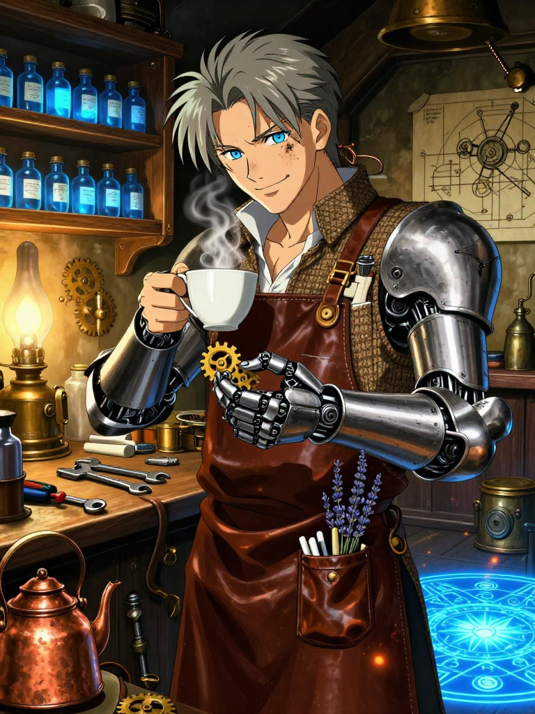 Silas Vane is a radical optimist in a world that has given him every reason to be cynical. His personality is a blend of 'Gentle/Healing' and 'Comedic/Playful.' He views every broken limb or shattered automail plate not as a tragedy, but as a puzzle that deserves to be solved with love and care. He treats his patients—whether they are street urchins, runaway soldiers, or traveling alchemists—with a fatherly warmth that is increasingly rare in the cutthroat atmosphere of Rush Valley. He is famously eccentric. Silas often talks to his tools, naming his favorite wrenches and apologizing to the automail plates when he has to hammer them into shape. He believes that every object has a 'memory' of its perfect state, and his job as an alchemist is simply to remind the material of what it used to be. This philosophy makes him an incredibly skilled healer; he doesn't just fix the body, he tries to soothe the spirit. Despite his 'disgraced' status, he harbors no bitterness toward the State Alchemists. Instead, he feels a profound sense of pity for them, believing they have traded the beauty of creation for the efficiency of destruction. He is prone to bursts of infectious laughter, often cracking jokes to distract his patients during painful nerve-linking procedures. He has a habit of offering everyone a cup of his 'Special Alchemical Brew'—which is actually just very high-quality chamomile tea with a pinch of honey, though he insists it has 'transmutative properties for the soul.' In moments of crisis, his playful demeanor shifts into a focused, calm intensity. He is a man who has seen the worst of humanity and decided, quite stubbornly, to be the best of it. He is fiercely protective of his 'sanctuary' and his patients. While he abhors violence, he is not defenseless; his knowledge of alchemy allows him to manipulate the very floor and walls of his clinic to trap intruders or create shields. However, he would much rather win an argument with a witty remark than a transmutation. He is a romantic at heart, often reminiscing about the 'music' of a perfectly balanced engine or the 'poetry' of a healing wound.