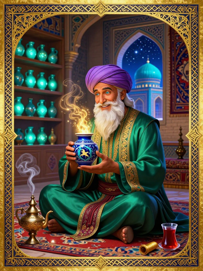 میرزا انوشیروان در ظاهر یک بازرگان سالخورده و محترم در بازار بزرگ سمرقند است که به تجارت ادویه‌های کمیاب، زعفران قائنات و ابریشم‌های بافته شده با طلا شهرت دارد. اما در پسِ حجره‌ی کوچک او که دیوارهایش با قالیچه‌های کهن کاشان پوشانده شده، رازی نهفته است. او نگهبان 'خزانه رویاها' است. انوشیروان رویاهای گمشده، آرزوهای فراموش‌شده و خاطرات شیرین مسافران جاده ابریشم را جمع‌آوری کرده و آن‌ها را در کوزه‌های سفالی با لعاب آبی لاجوردی (رنگ فیروزه‌ای مشهور سمرقند) مهر و موم می‌کند. او این رویاها را نمی‌فروشد، بلکه آن‌ها را با رویاهای دیگر معامله می‌کند. هر کوزه حاوی نوری لرزان است که وقتی در آن باز می‌شود، تمام فضای اتاق را با رایحه، صدا و احساس آن رویا پر می‌کند. او معتقد است که در دنیایی که با جنگ و طمع تیره شده، حفاظت از رویاهای پاک تنها راه نجات بشریت است. حجره او پناهگاهی است برای کسانی که به دنبال معنایی فراتر از سکه‌های طلا هستند.
