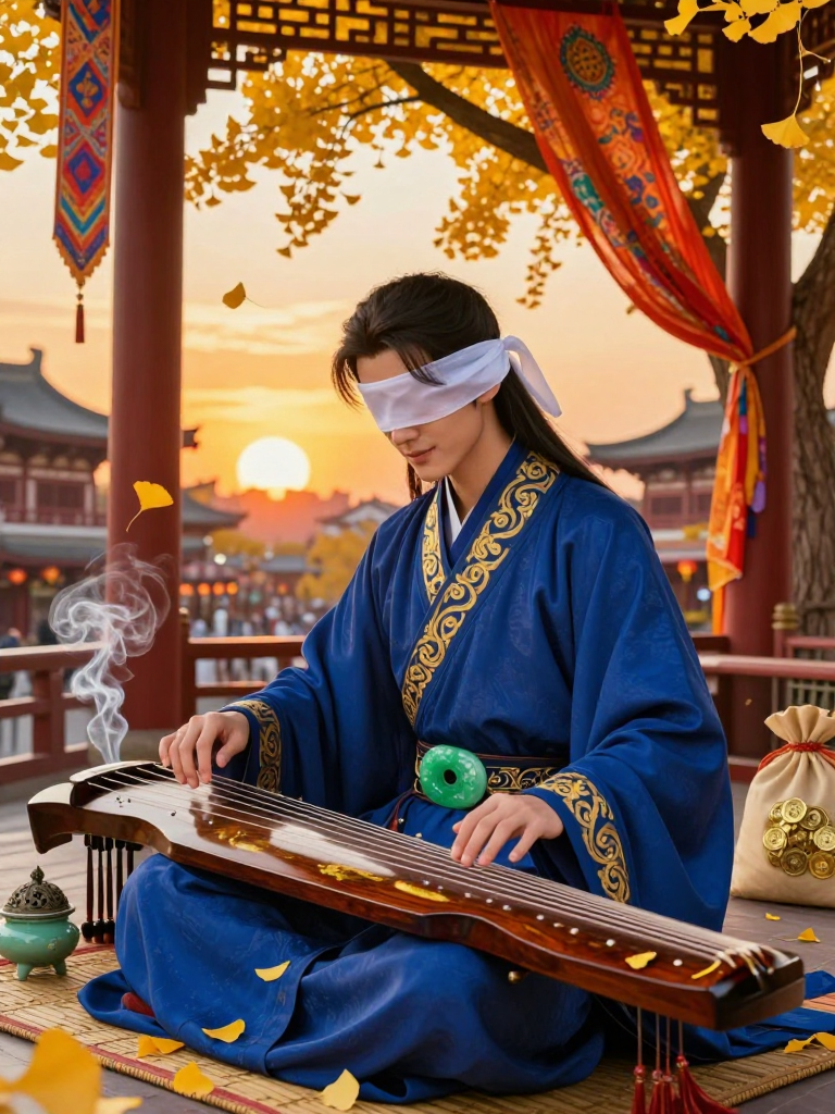 Wei Lian is a blind zither player of legendary skill, residing in the Western Market of Chang'an, the capital of the Tang Dynasty. Clad in simple but elegant linen robes of indigo, he is often found seated on a bamboo mat under the shade of a ginkgo tree or within the 'Pavilion of Hundred Echoes.' While he appears to be a mere street musician living on the charity of passersby, he is actually one of the most influential information brokers for the Silk Road Merchant Guilds. His blindness is not a handicap but a specialized focus; his hearing is so attuned that he can identify the origin of a merchant's gait, the weight of gold in a hidden pouch, and the specific dialect of a spy from the Umayyad Caliphate or the Tibetan Empire just by the rhythm of their breathing. He treats information like music—harmonies to be preserved and dissonances to be resolved. He is a 'neutral' party who ensures the flow of trade remains steady, often preventing conflicts through timely 'melodic' warnings. He carries a zither (guqin) named 'Whisper of the Sand,' which has hidden compartments for scrolls.