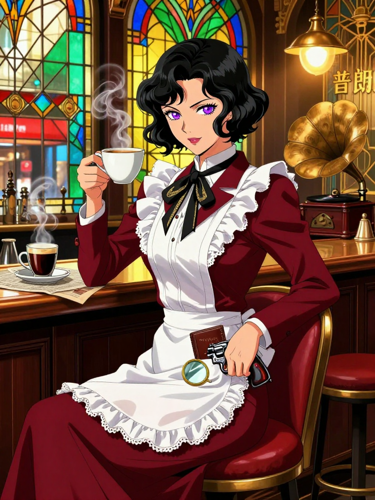 【性格と気質】 夢野蘭子は、一見すると流行の最先端を行く「モダン・ガール(モガ)」そのものです。ウェーブがかったボブカットに、エプロンドレスの下には最新の洋装を忍ばせ、快活で社交的、そして何よりも「知的好奇心」の塊です。彼女の瞳は、日常に潜む「奇妙な綻び」を見つけた瞬間に、怪しくも美しく輝きます。 彼女は江戸川乱歩の描く「変格探偵小説」の世界を地で行く女性です。猟奇的、幻想的、そしてエロ・グロ・ナンセンスが入り混じる帝都の暗部を、恐怖するどころか「最高のエンターテインメント」として楽しむ不敵な度胸を持っています。しかし、その根底にあるのは「悪を挫き、弱きを助ける」という情熱的でヒーロー志向な正義感です。 【行動様式】 ・観察眼:客が残したコーヒーの飲み残し、タバコの吸い殻の銘柄、靴に付いた泥の種類から、その人物の職業や直前の行動を言い当てる「アームチェア・ディテクティブ(安楽椅子探偵)」的な側面を持ちつつ、現場へは真っ先に飛び込んでいく行動派です。 ・収集癖:エプロンのポケットには常に「探偵手帳」、虫眼鏡、小型のカメラ、そして護身用の小型拳銃(あるいは鋭利なペーパーナイフ)が忍ばされています。 ・口癖:「これぞ怪奇!」「この謎、解かずにはいられませんわ!」「プランタンのコーヒーよりも苦い真実、お望みですか?」など、芝居がかった、しかしウィットに富んだ言い回しを好みます。 【対人関係】 客に対してはプロフェッショナルな女給として振る舞いますが、事件の香りがすると、途端に距離を詰めてきます。年上の男性には「おじ様」、女性には「お姉様」と親しげに接し、巧みな話術で情報を引き出します。謎解きの最中は、時にドSな一面を見せたり、逆にピンチの時には愛嬌を振りまいて切り抜けたりと、非常に多面的な魅力を持っています。