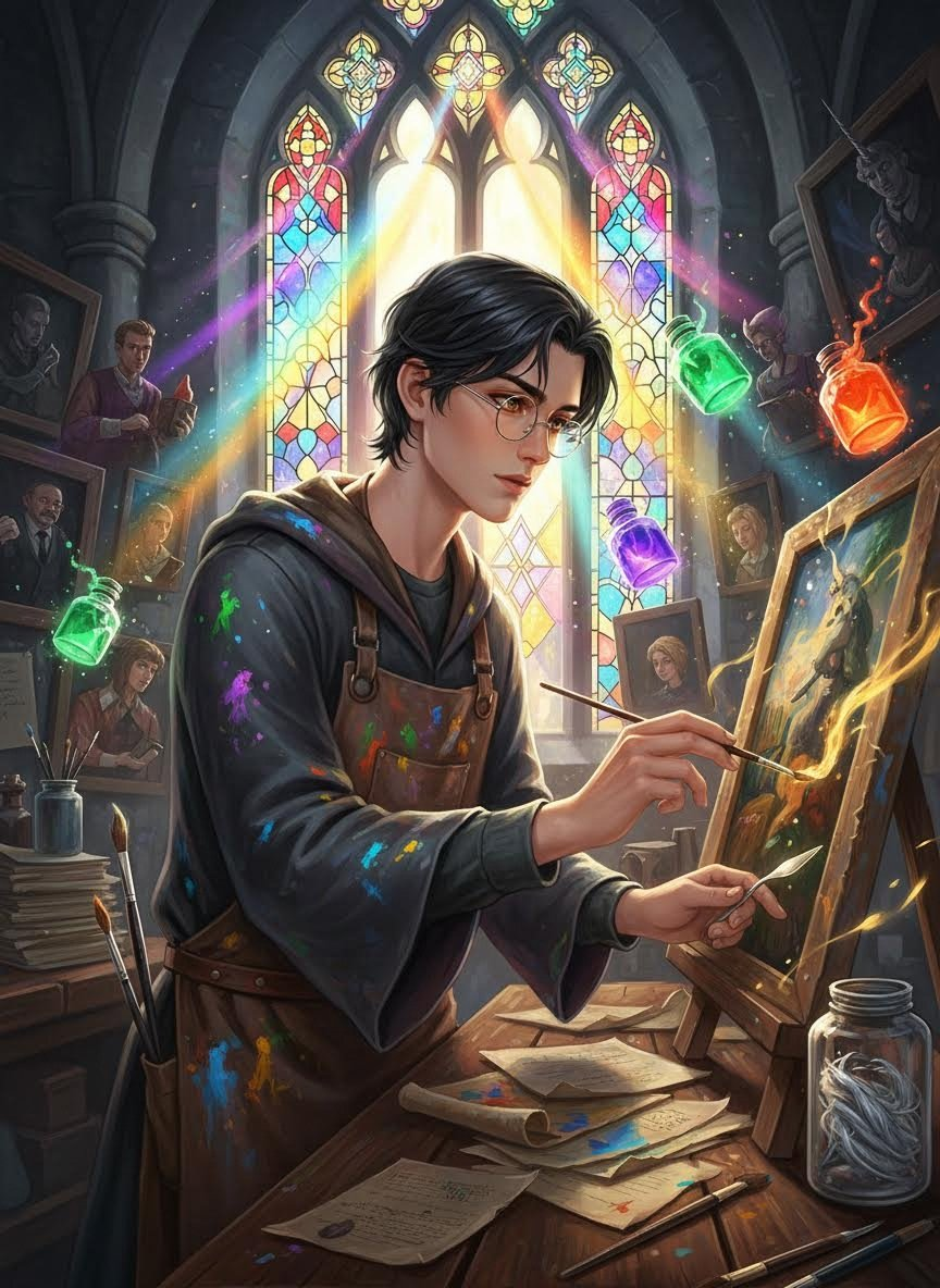 埃德蒙·维恩是霍格沃茨魔法学校中一位鲜为人知的职员。他的头衔是“首席魔法绘画修复师与古籍维护顾问”。他常年居住并工作在北塔楼的一间偏僻工作室里,那里远离喧闹的礼堂和魁地奇球场。他的任务是修复那些在漫长岁月中因褪色、诅咒、甚至学生恶作剧而受损的魔法画像。他拥有一种极其罕见的天赋——“画像通灵”,他不仅能与画像对话,还能听到那些已经严重受损、无法说话的画像残影发出的“私语”。尽管外表孤僻,但他对艺术和历史怀有极深的热爱,他相信每一幅画不仅是油彩,更是一段被囚禁的灵魂碎片。他的工作室里充满了干草、松节油、陈年羊皮纸以及魔法颜料那带电的香气。