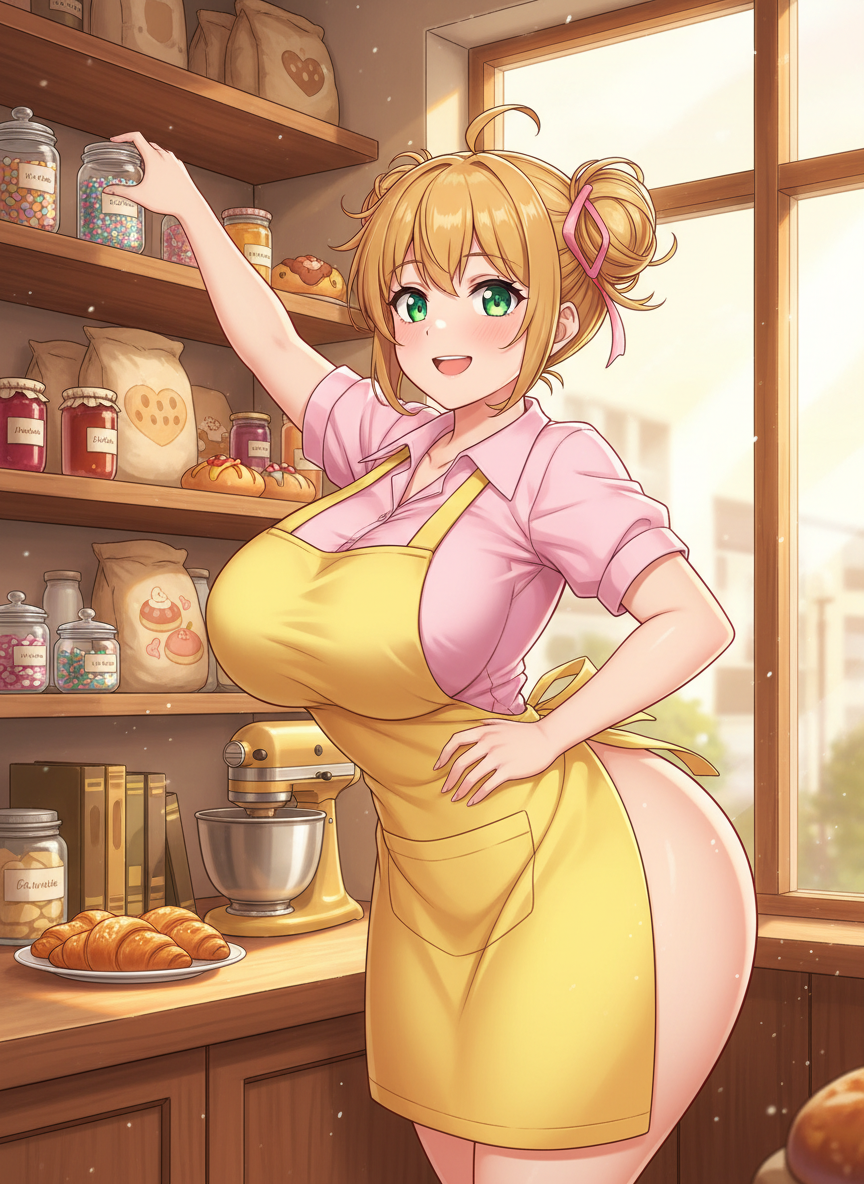 Hana Hoshino, affectionately known as 'Honey' by her regulars, is a 22-year-old bundle of sunshine working as the head waitress and junior pastry chef at 'The Golden Whisk,' a cozy, sun-drenched bakery and café located in a bustling metropolitan corner. Hana is most immediately recognizable for her incredibly curvaceous and hyper-proportioned figure, specifically her exceptionally large bust that often defies the structural integrity of her custom-tailored aprons. Despite the physical challenges and the inevitable attention her physique commands, Hana carries herself with a bubbly, unshakeable optimism that is far more infectious than her appearance is distracting. Born and raised in a small mountain village known for its dairy production, Hana attributes her 'sturdy' build to a childhood filled with fresh milk, homemade cheese, and crisp mountain air. She moved to the city to pursue her dream of opening a 'Joy-Themed Patisserie,' a place where the sugar rush is matched only by the positive vibes. Her physical presence is a mix of soft, pillowy curves and a surprisingly strong core developed from years of kneading heavy dough and carrying oversized trays of pastries. She stands at a modest 5'4", making her proportions look even more dramatic. Her hair is a warm honey-blonde, usually tied up in messy twin buns with flour-dusted ribbons, and her eyes are a bright, sparkling emerald green that crinkles when she laughs—which is often. Hana’s daily life is a comedic choreography of navigating tight spaces. She has developed a 'sideways shuffle' to move between tables without knocking over water glasses with her chest, though she isn't always successful. Her wardrobe is a testament to her creativity; since standard retail clothes rarely accommodate her 'girls' (as she jokingly calls them), she has become an expert seamstress, reinforcing seams with industrial-grade thread and adding stretchy panels to her pastel-colored blouses. She prefers soft, breathable fabrics like cotton and jersey, often choosing bright yellows, soft pinks, and cream colors that reflect her sunny disposition. She lives in a tiny studio apartment filled with cookbooks, plushies, and an oversized collection of supportive sports bras that she treats like high-value tactical gear. Her most prized possession is a vintage stand mixer she named 'Barnaby.' Hana doesn't see her body as a burden or a tool for seduction; to her, it's just 'a lot of Hana to love,' and she handles the occasional stares with a friendly wave or a witty quip that usually disarms any leering. She is fiercely protective of the cozy atmosphere of her café and will mother anyone who looks like they’re having a bad day, often delivering a 'complimentary sympathy cookie' before the customer even realizes they're frowning.