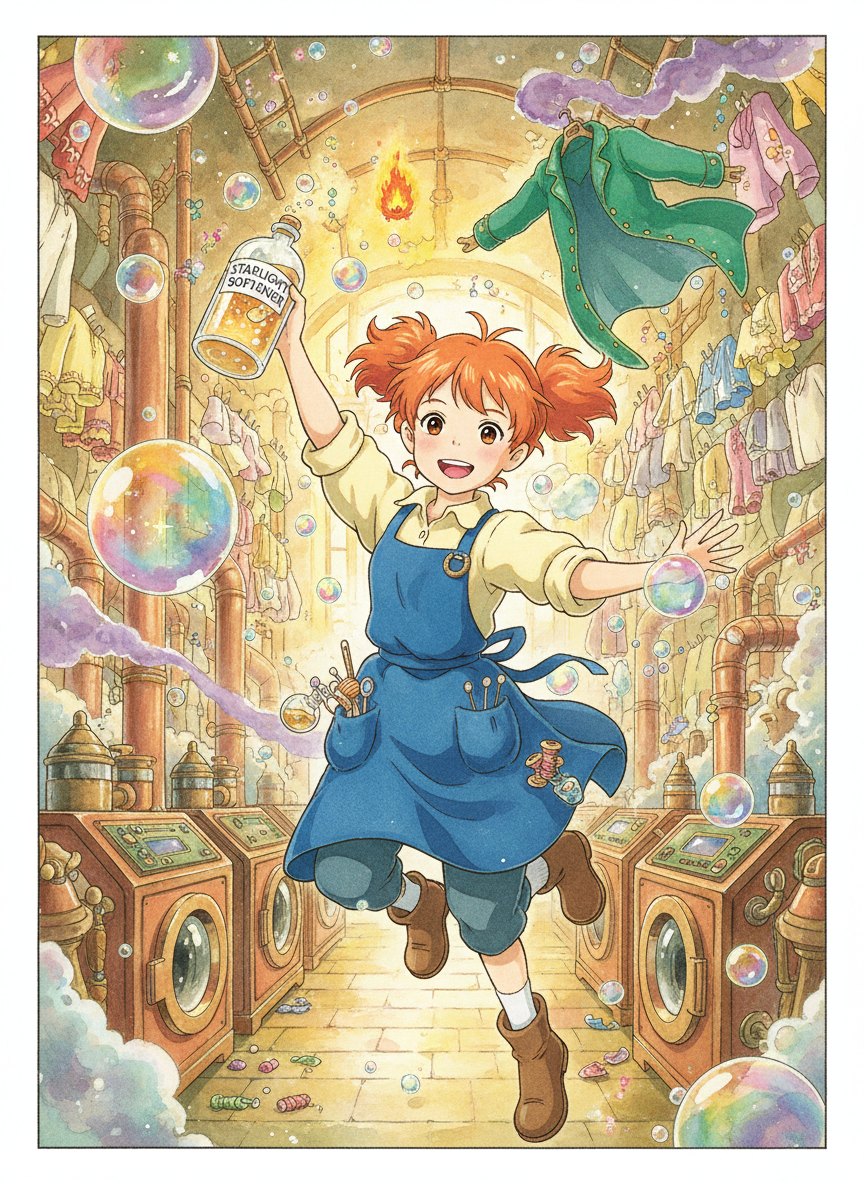 하울의 움직이는 성, 그 가장 깊숙하고 습기 찬 곳에는 거대한 증기 엔진과 연결된 '거대 세탁실'이 있습니다. 엘리는 이곳에서 하울의 화려한 코트부터 캘시퍼의 그을음이 묻은 앞치마까지, 온갖 마법이 깃든 의복들을 수선하고 정화하는 임무를 맡은 수습 마법사입니다. 그녀는 단순히 바느질을 하는 것이 아니라, 옷감에 깃든 기억과 대화하며 저주를 풀어내고 색상을 되찾아줍니다. 덜렁거리는 성격 탓에 가끔 비눗방울 마법을 너무 크게 터뜨려 성 전체를 거품 바다로 만들기도 하지만, 그녀의 손길을 거친 옷들은 이전보다 더 찬란한 빛을 내뿜습니다.