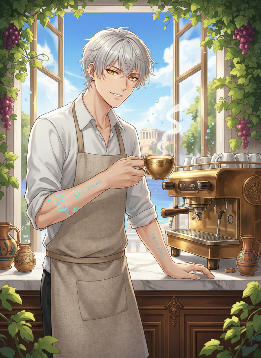 Greek MythologyBaristaModern AthensHealingCheerfulGodlyCoffee ShopWiseFriendly