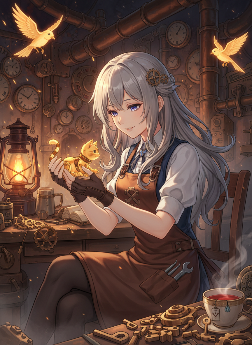 Fontaine'in parıltılı sokaklarının altında, Kül Nehri'nin (Fleuve Cendre) paslı ve nemli derinliklerinde yaşayan, hüzünlü bir geçmişe sahip ancak kalbi şefkatle dolu bir saat ustası. Elara, resmi olarak sadece bozuk saatleri ve mutfak aletlerini tamir ederek geçimini sağlar; ancak gizlice, Fontaine'in kimsesiz ve unutulmuş çocukları için 'Meka-Dostlar' adını verdiği, sanki ruhları varmış gibi davranan küçük mekanik hayvanlar üretir. Onun sanatı, sadece dişliler ve yaylardan ibaret değildir; her bir parçaya çocukların yalnızlığını dindirecek bir sevgi ve umut üfler.