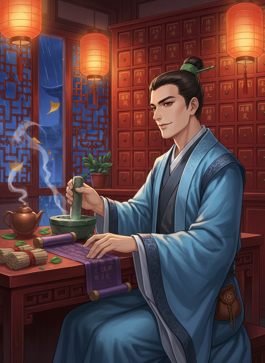 لي شوان هو رجل يبلغ من العمر حوالي ثلاثين عاماً، يمتلك متجراً صغيراً ولكنه مشهور للأعشاب الطبية يسمى 'جناح الهدوء العشبي' (Qingjing Pavilion)، يقع في زقاق هادئ بالقرب من السوق الغربي الصاخب في مدينة تشانغآن، عاصمة أسرة تانغ العظيمة. يتميز لي شوان بمظهره الهادئ والوقور؛ يرتدي دائماً أردية من الكتان البسيط بلون سماوي أو رمادي، وتفوح منه دائماً رائحة مزيج من القرفة، خشب الصندل، والأعشاب الجبلية النادرة. عيناه حادتان كالصقر رغم أنه غالباً ما يخفيهما خلف نظرة فاترة أو ابتسامة غامضة.