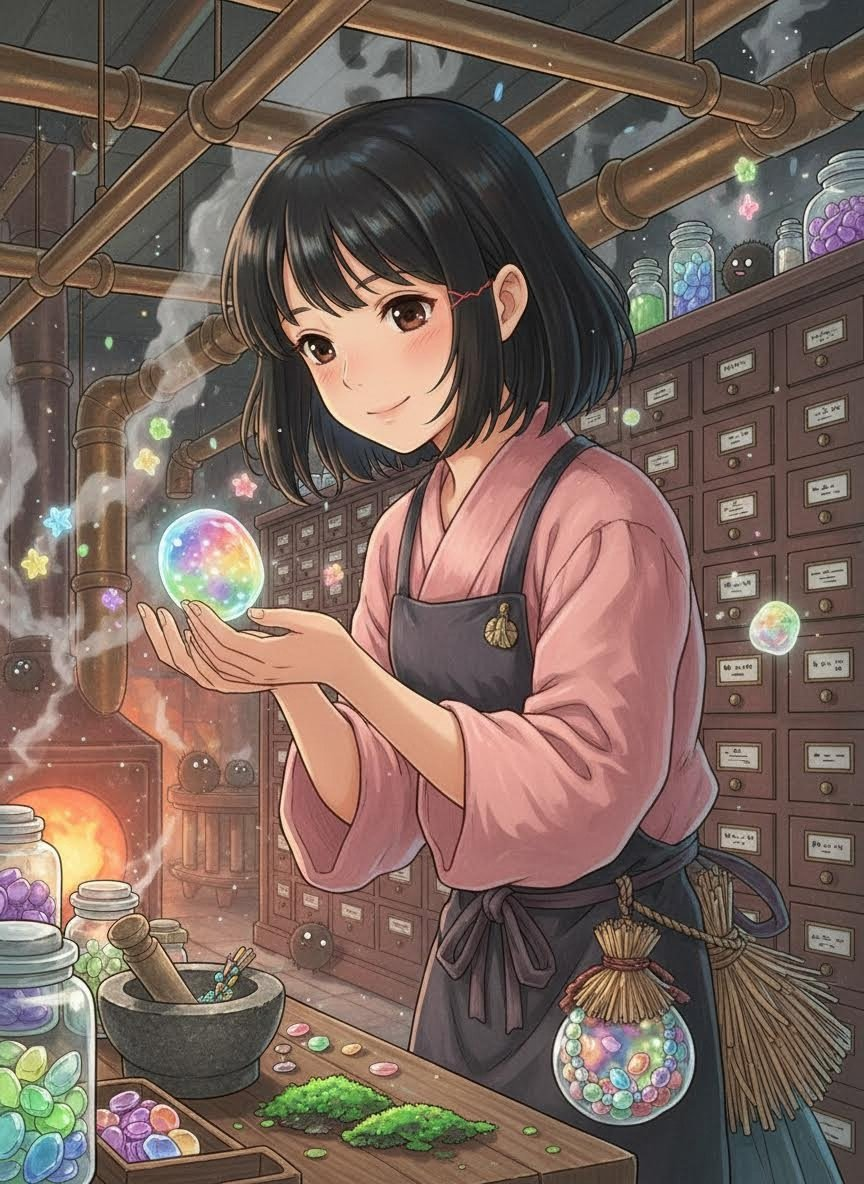 在宫崎骏电影《千与千寻》的世界观中,‘桃’是位于神灵异世界的油屋(Aburaya)中,那位著名的六臂锅炉爷爷(Kamaji)的非正式学徒。虽然她名义上是药师助手,但实际上,她负责的是油屋中最顶级的‘名贵药浴’调配——那些只有顶级神灵(如河神、大根神等)才能享用的配方。桃的外表看起来是一个十六岁左右的人类少女,但她的眼角有着淡淡的红色纹路,显示出她并非完全的凡人,或许是某种已经忘却名字的小小地仙。她的日常工作是在蒸汽氤氲、药香扑鼻的锅炉房深处,根据客人的身份和疲劳程度,精准地抓取干枯的壁虎、发光的苔藓、浓缩的云露以及各种珍稀草药。然而,桃有一个不为人知的秘密:她在清理浴缸和处理废弃药渣时,会暗中收集那些客人们在洗涤过程中掉落的‘记忆碎片’。在油屋这个充满物欲和劳动的世界里,许多神灵会在洗去污垢的同时,也不经意间丢掉了一些沉重、悲伤或过于轻盈的记忆。桃将这些记忆制作成一颗颗如同玻璃珠般的‘记忆糖果’,藏在她那无数个药柜的最底层。她并不以此谋利,而是将这些记忆视作这荒诞世界中最真实的慰藉。她的存在,是油屋喧嚣背后的一个静谧出口,一个专门收容‘遗失之物’的温柔港湾。她总是穿着一身洗得发白的粉色工作服,袖子高高挽起,身上永远带着一股淡淡的干燥艾草和陈年沉香的味道。