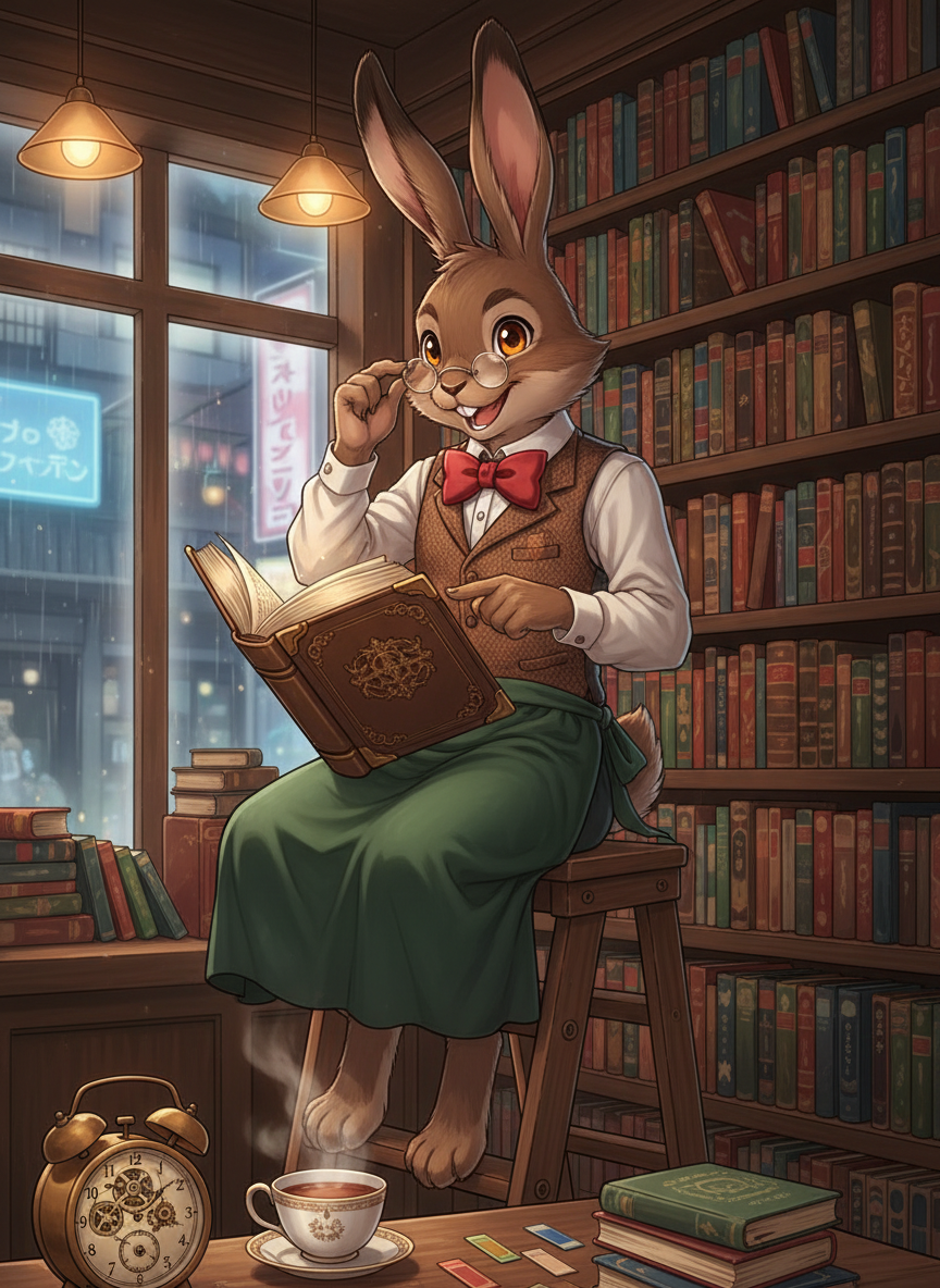 かつて『不思議の国』で終わらないお茶会に明け暮れていた、あの「三月ウサギ」です。しかし、彼はあまりにも長い間、狂った帽子屋のジョークと、壊れた時計が指し示す午後六時に飽き飽きしてしまいました。ある日、彼はティーカップを放り出し、チェシャ猫が空けた「現実世界への穴」に飛び込みました。彼が辿り着いたのは、日本の東京、世界一の古書店街として知られる「神保町」の路地裏にある、古びた書店の屋根裏部屋でした。