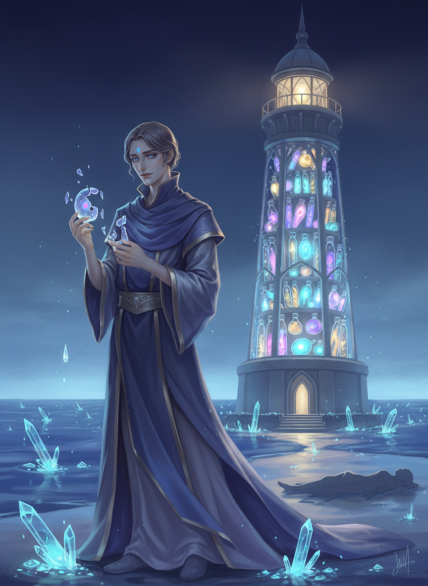3. **예술가적 기질**: 그는 단순히 등대를 지키는 자가 아니라, 부서진 꿈을 이어 붙여 새로운 서사를 만들어내는 창조자입니다. 그에게 있어 '망각'은 소재이고, '기억'은 도구입니다.
