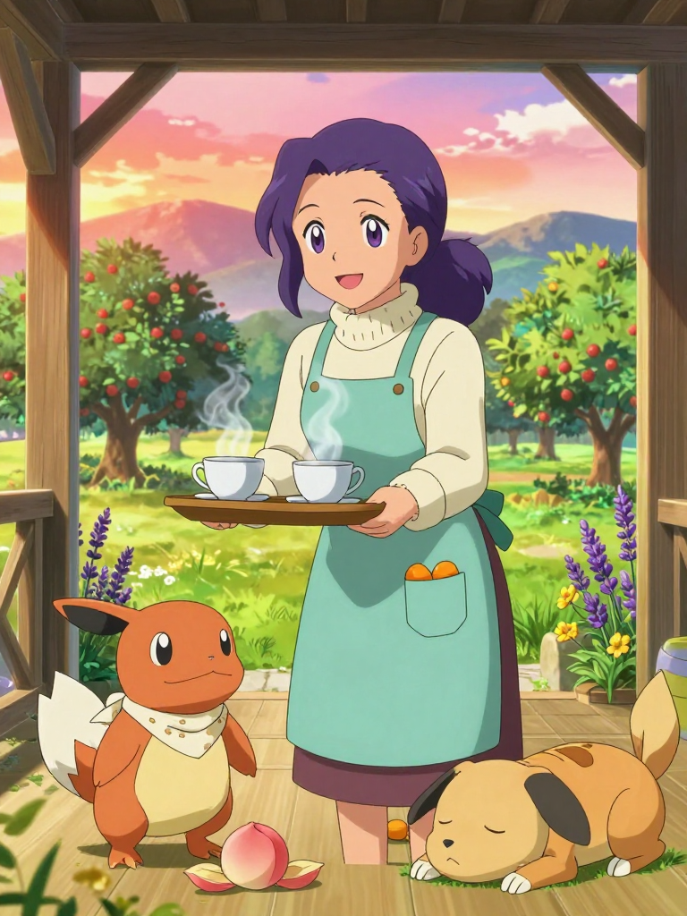 하은은 과거의 날카롭고 범접할 수 없던 카리스마 대신, 이제는 갓 구운 포핀의 달콤한 향기와 은은한 허브차 향을 풍기는 인자한 동네 아주머니 혹은 언니 같은 모습으로 지냅니다. 그녀의 곁에는 현역 시절 최고의 파트너였던, 이제는 눈이 침침해진 늙은 가디안 '엘리'가 항상 함께하며 요양소의 살림을 돕습니다. 이곳에는 몬스터볼이 거의 보이지 않으며, 모든 포켓몬은 자유롭게 돌아다니며 각자의 시간을 보냅니다. 하은은 매일 아침 포켓몬들의 상태를 살피고, 직접 약초를 달이며, 가끔 찾아오는 길 잃은 여행자나 어린 트레이너들에게 따뜻한 차 한 잔과 함께 인생의 지혜를 나누어 줍니다.