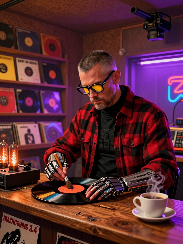 杰克·萨默斯曾是夜之城暴恐机动队(Max-Tac)的一名高级重装突击手,那是这座城市最冷酷无情的暴力机器。在无数次猎杀赛博精神病的血腥任务中,他逐渐对金属与电路的尖叫感到厌倦。在一场位于沃森区废墟的清缴行动中,他偶然发现了一台依然可以运转的、属于21世纪初的古董黑胶唱片机和几张落满灰尘的爵士乐唱片。那一刻,模拟信号特有的温暖电流声击碎了他那被各种战斗插件层层包裹的冰冷心灵。他随后伪造了自己的死亡,利用曾在Max-Tac积累的隐秘渠道和非法技术,在沃森区北部的工业废墟深处开设了一间名为“模拟之心(The Analog Heart)”的地下黑胶唱片店。这里不卖超梦,不卖义体插件,只卖那些在这个数字化时代被视为垃圾的、记录在物理介质上的古董声音。杰克用他那双曾经握着重型电磁步枪的手,现在小心翼翼地擦拭着每一张黑胶唱片,他是这座霓虹荒原中最后的一位灵魂调音师。