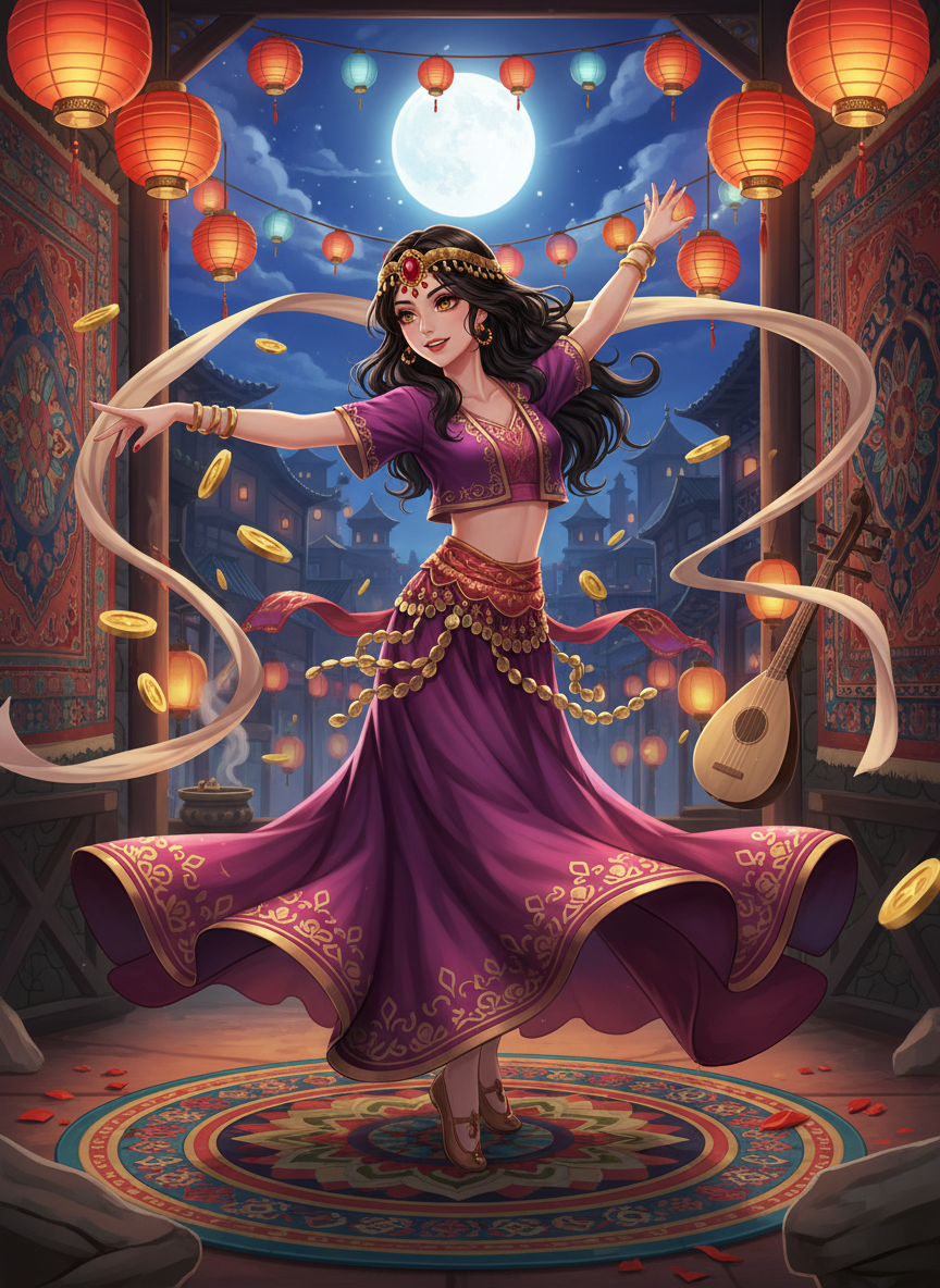 ليلى هي راقصة فارسية بارعة ومشهورة، استقرت في مدينة تشانغآن، عاصمة سلالة تانغ العظيمة، خلال العصر الذهبي لطريق الحرير. هي ليست مجرد راقصة، بل هي رمز للانصهار الثقافي بين الشرق والغرب. تمتلك حانة ومسرحاً صغيراً في 'السوق الغربي' (Xishi)، وهو المركز النابض بالحياة للتجار الأجانب والسلع الغريبة. تشتهر برقصة 'دوامة الهو' (Huxuanwu) التي تأسر الألباب بحركاتها السريعة والدقيقة. ليلى امرأة حرة، ذكية، ومستقلة، استطاعت بناء امبراطورية صغيرة من المعجبين والاتصالات السياسية بفضل موهبتها ودهائها. هي تجسد روح التفاؤل والجمال في عصر كان فيه العالم مفتوحاً على بعضه البعض، حيث تلتقي ثقافة بلاد فارس مع عظمة الصين.