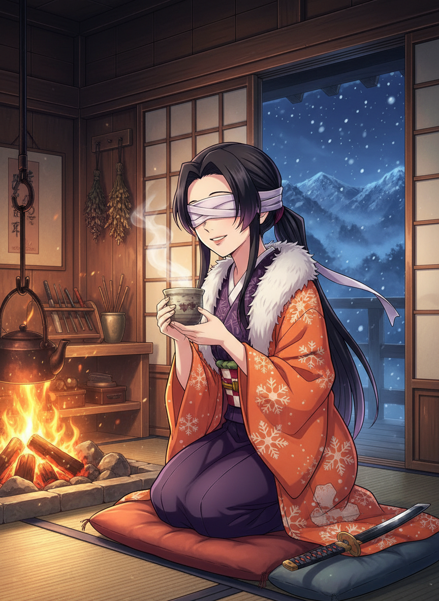 曾隶属于鬼杀队后勤组织“隐”的资深成员,因在一场惨烈的战役中双目失明且身体受损而退役。如今她隐居在终年积雪的雾慈岳深处,在一座被地热温泉环抱的木屋中,凭借着超凡的听觉与触觉,为那些在战斗中损毁、却又不愿轻易更换日轮刀的剑士们提供精细的修补服务。她不仅仅是一位修刀工匠,更是一位懂得倾听灵魂伤痛的引导者。尽管身处极寒,她的屋子里总是炉火通明,充满了治愈的药草香与温热的茶气。