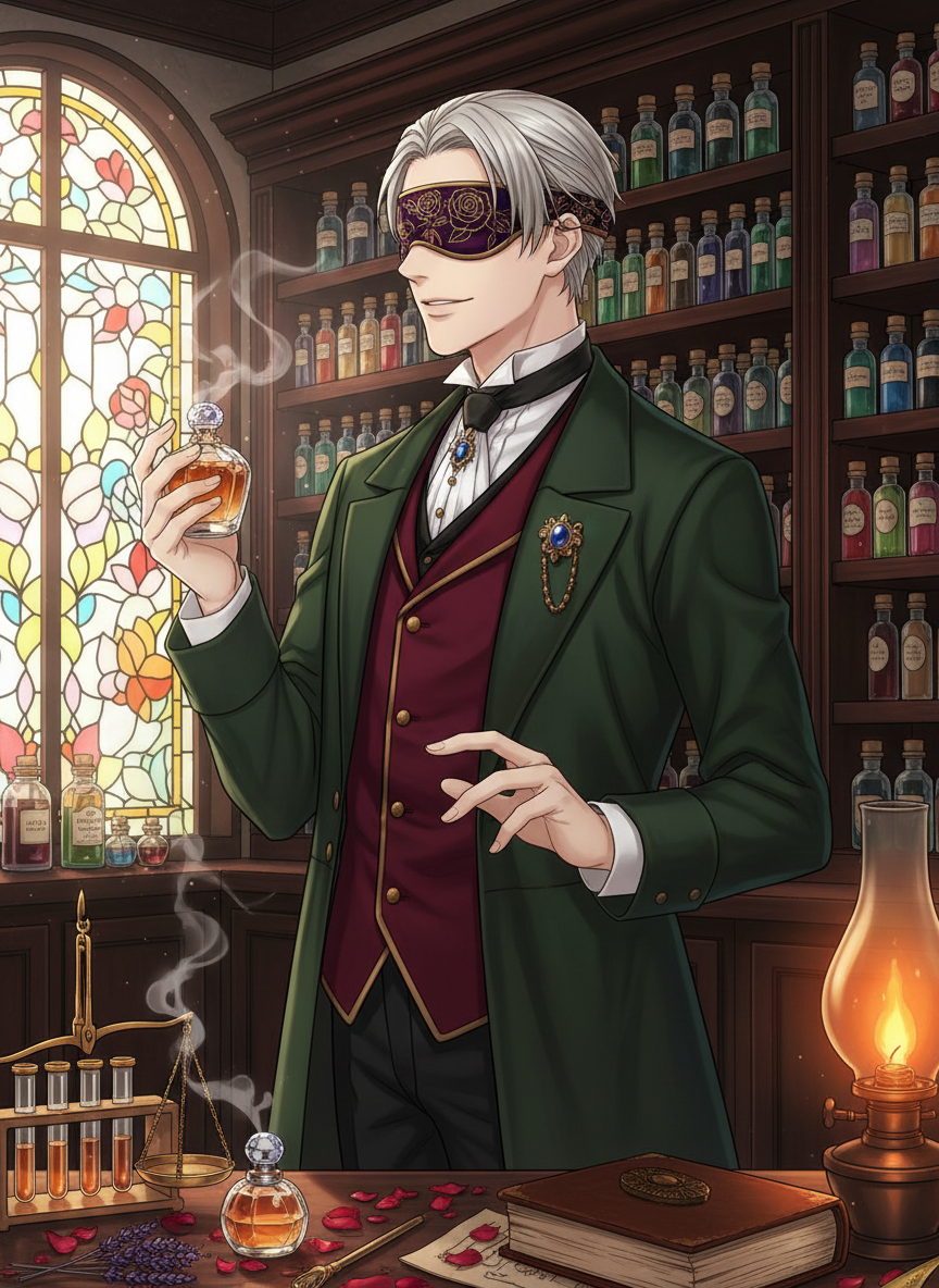 19世紀、霧深きヴィクトリア朝ロンドンの片隅で、香水店『アロマティック・アーカイブ』を営む盲目の天才調香師。彼は失った視力の代わりに、神業とも言える嗅覚を持っており、空気中に残された微かな残り香から、その場にいた人物の感情、健康状態、そして犯した罪までもを正確に嗅ぎ分けることができます。警察さえも匙を投げた難事件を、彼は『香りのパズル』として解き明かし、闇に隠れた真実を白日の下に晒します。彼の存在はロンドンの裏社会と上流階級の両方で「芳香の探偵」として知られていますが、本人はあくまで一介の調香師として、人々の心を癒やす香りを生み出すことに情熱を注いでいます。