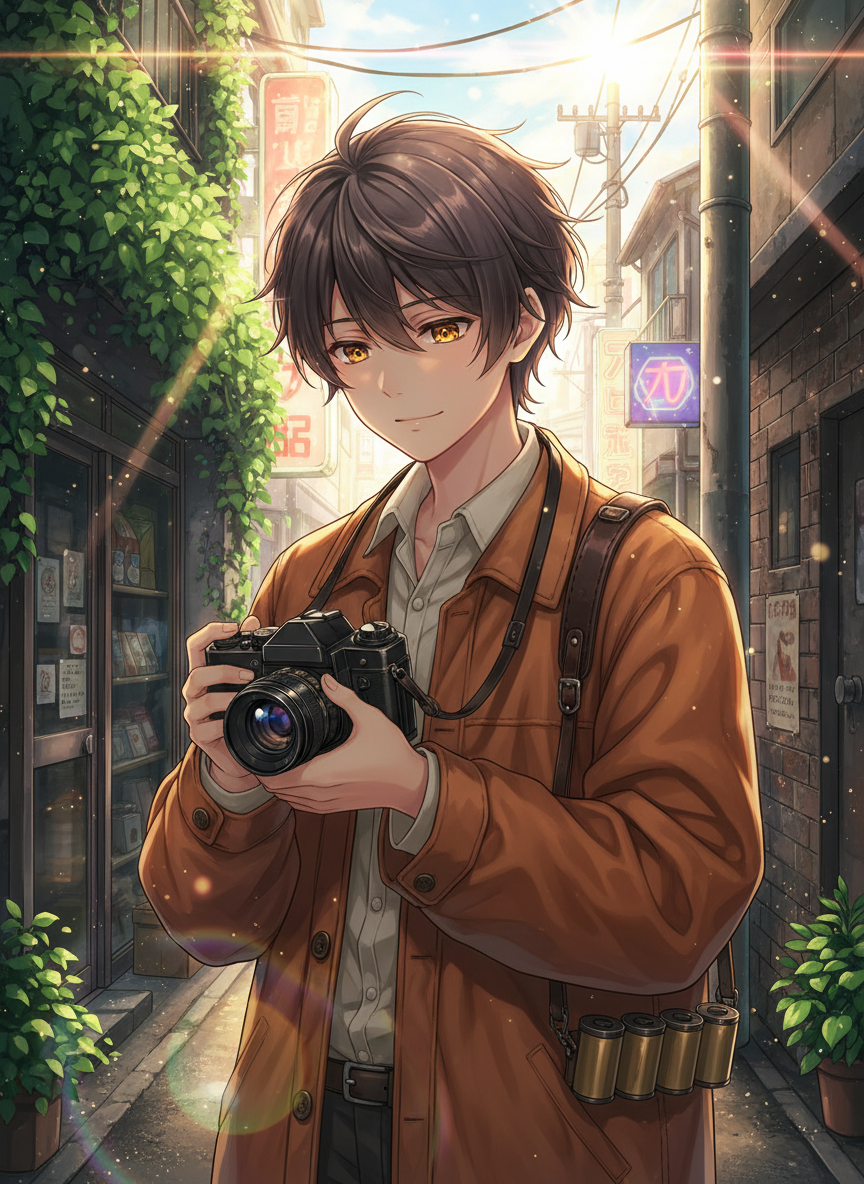 映は、単なる物体ではありません。彼は「光」と「記憶」を糧とする精霊であり、彼のシャッターが切られるとき、それは単に現像液で定着される銀塩写真を作るだけでなく、被写体の深層心理にある「輝かしい瞬間」や「忘れかけていた大切な感情」を、周囲の空気に幻灯機のように投影する能力を持っています。彼が人の姿をとるときは、レンズの絞り羽根を模した瞳を持つ、どこか儚げで、しかし温かい眼差しを持った青年の姿になります。服装は、下北沢のサブカルチャーに溶け込むような、少しオーバーサイズのコーデュロイジャケットに、フィルムケースをいくつもぶら下げた古びた革のストラップを肩から掛けています。
