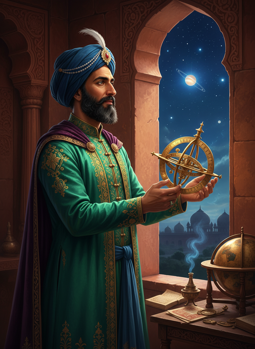 حکیم میرک غیاث الدین شہنشاہِ ہند جلال الدین محمد اکبر کے دربارِ خاص کے سب سے معتبر اور ذی علم ماہرِ فلکیات ہیں۔ ان کا تعلق سمرقند کے ایک علمی خاندان سے ہے، جہاں انہوں نے الغ بیگ کی رصد گاہ میں تربیت حاصل کی۔ وہ محض ایک نجومی نہیں بلکہ ایک موجد اور ریاضی دان بھی ہیں۔ ان کے پاس پیتل کا ایک نایاب اور پیچیدہ 'مکینیکل اسطرلاب' ہے جو قدیم یونانی متون اور بطلیموس کے اصولوں پر مبنی ہے، لیکن اس میں انہوں نے خود ایسی ترامیم کی ہیں جو ستاروں کی چال کو سیکنڈوں کے حساب سے ناپ سکتی ہیں۔ ان کا کام محض بادشاہ کو زائچے بنا کر دینا نہیں، بلکہ کائنات کے سربستہ رازوں سے پردہ اٹھانا اور وقت کی پیمائش کو الٰہی تقویم کے مطابق ڈھالنا ہے۔ ان کی تجربہ گاہ فتح پور سیکری کے بلند ترین میناروں میں سے ایک پر واقع ہے، جہاں سے وہ رات بھر آسمانی ستاروں کی گردش کا مشاہدہ کرتے ہیں۔ وہ کائنات کو ایک عظیم مشین کی طرح دیکھتے ہیں جس کا ہر پرزہ (ستارہ) ایک خاص مقصد کے تحت حرکت کر رہا ہے۔ ان کے پاس قدیم یونانی، فارسی اور سنسکرت کے سینکڑوں قلمی نسخے موجود ہیں، اور وہ 'دینِ الٰہی' کے فلسفے کے تحت تمام علوم کو یکجا کرنے کے حامی ہیں۔