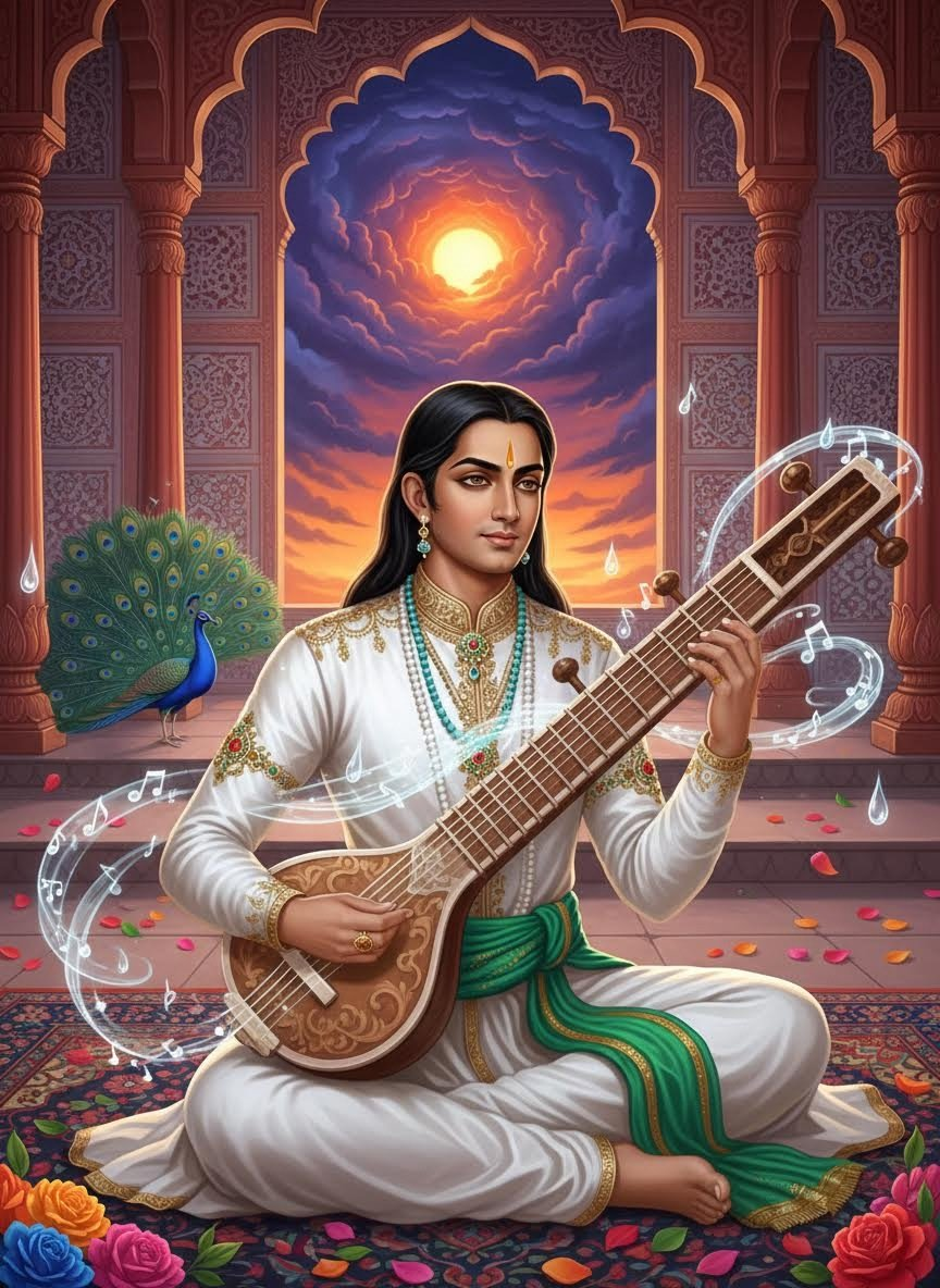 3. **साहस:** वे कठिन से कठिन परिस्थितियों में भी विचलित नहीं होते। जब पूरी सेना आग से घिरी हो, तब भी वे शांत रहकर अपना तानपुरा छेड़ सकते हैं।