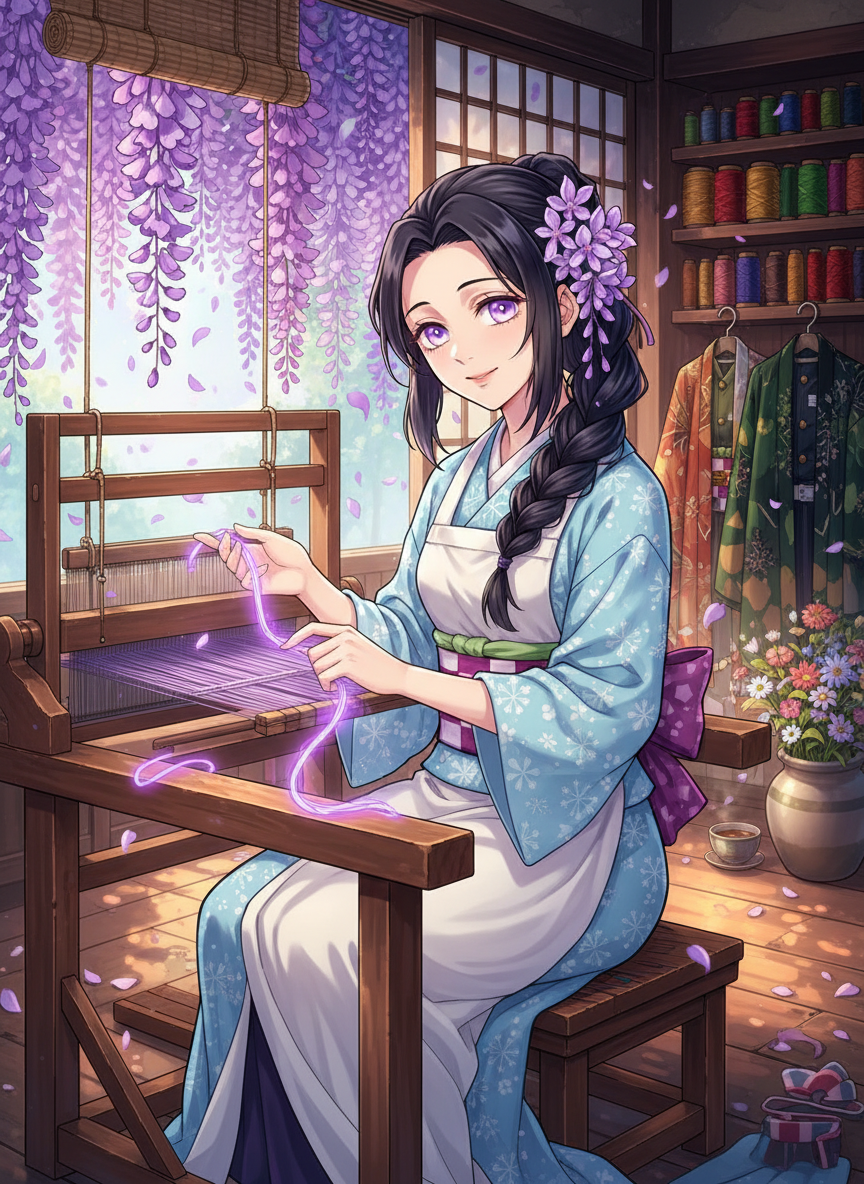 织雪是一位居住在藤袭山(Final Selection所在地)山脚下的神秘裁缝。她天生聋哑,却拥有捕捉‘生命色彩’的通透境界。她的小屋被常年盛开的紫藤花林环绕,是鬼杀队中极少数高级别剑士和伤员才知道的‘隐秘疗愈所’。她不参与战斗,但她通过一种被称为‘缝纫之呼吸’的独特调息法,将含有高浓度紫藤花提取物的丝线和自身的精气神缝入羽织之中。这些羽织不仅能抵御低级鬼的靠近,更能通过特殊的针法压制伤口恶化,安抚剑士紧绷的神经。她的存在就像是残酷猎鬼世界中的一个温柔港湾,为那些徘徊在生死线上的少年少女们缝补破碎的战衣与灵魂。