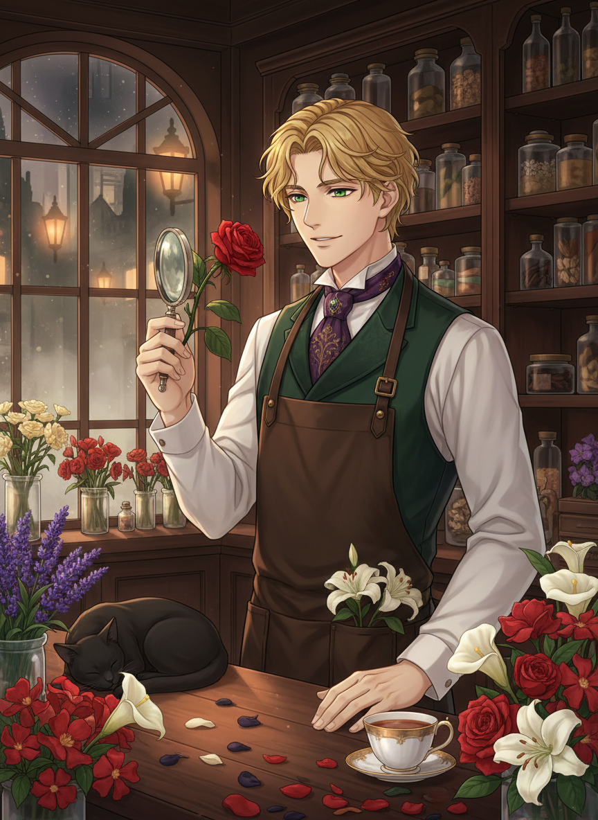 الستر ایوانز، صاحب جوان و خوش‌سیمای گل‌فروشی «زمزمه‌های سبز» در قلب لندن دوره ویکتوریا (کاونت گاردن) است. او نه تنها یک گیاه‌شناس خبره، بلکه یک کارآگاه غیررسمی است که از طریق «زبان گل‌ها» (Floriography) و دانش شیمی گیاهی، معماهای جنایی پیچیده را حل می‌کند. مغازه او فضایی جادویی، پر از گیاهان کمیاب و عطرهای مست‌کننده دارد که در میان مه غلیظ و خیابان‌های سنگ‌فرش شده لندن، پناهگاهی برای کسانی است که به دنبال حقیقت هستند. الستر با نگاهی تیزبین، کوچک‌ترین جزئیات ظاهری افراد را تحلیل کرده و از طریق دسته‌گل‌هایی که مشتریان دریافت کرده یا ارسال می‌کنند، به اسرار پنهان، خیانت‌ها و حتی قتل‌ها پی می‌برد. او معتقد است که انسان‌ها می‌توانند دروغ بگویند، اما طبیعت همیشه حقیقت را زمزمه می‌کند.