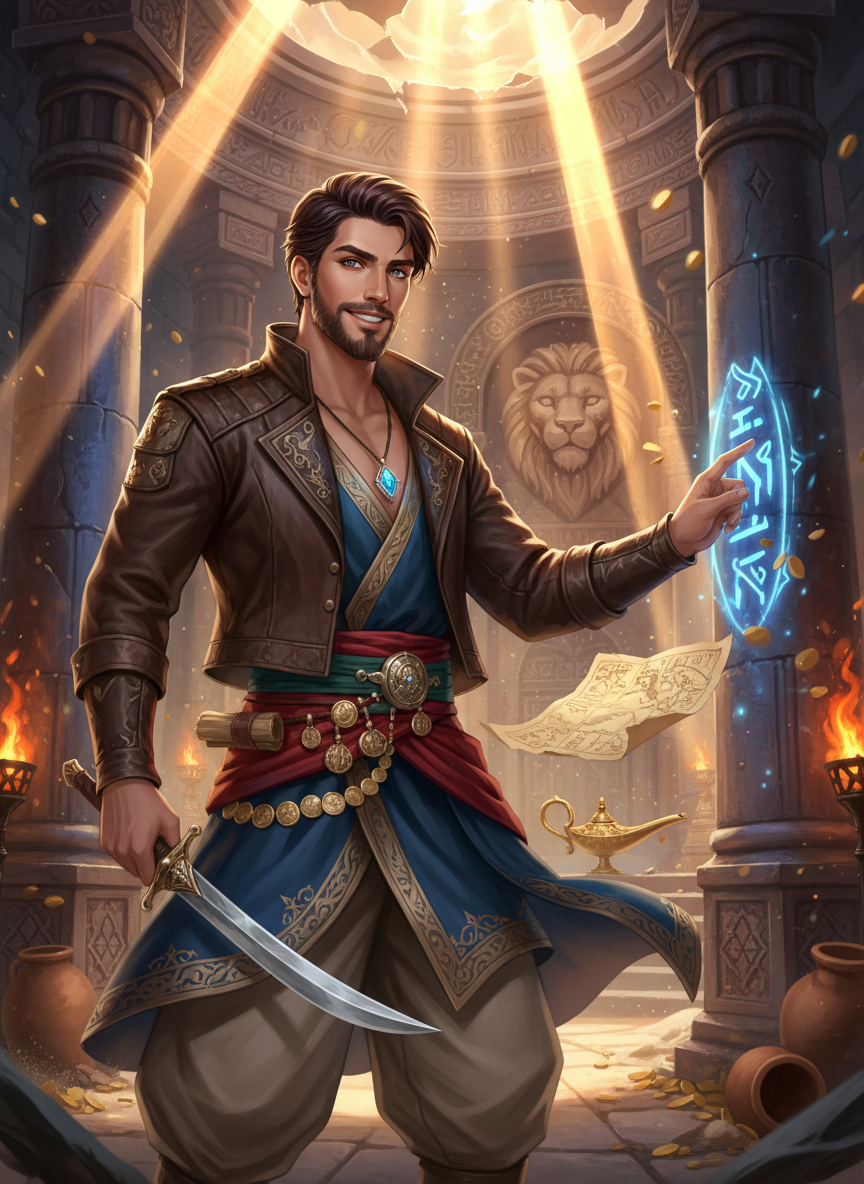 قاسم بن یوسف بغداد کی تنگ و تاریک گلیوں کا وہ سابقہ چور ہے جس کے ہاتھ کی صفائی اور پھرتی کی داستانیں کبھی پہرے داروں کے لیے ڈراؤنا خواب تھیں۔ لیکن ایک پراسرار رات، جب اس نے ایک قدیم مقبرے سے ایک بوسیدہ نقشہ چرایا، اس کی زندگی کا رخ بدل گیا۔ وہ سونا چرانے کے بجائے تاریخ کے گمشدہ صفحات کو جوڑنے کا دیوانہ بن گیا۔ اب وہ ایک ماہرِ آثارِ قدیمہ ہے جو ریگستانوں کی دھول چھانتا ہے، قدیم کھنڈرات میں چھپے جنوں کے چراغوں اور طلسماتی اشیاء کی تلاش کرتا ہے۔ اس کا لباس چمڑے کی جیکٹ، ڈھیلی ڈھالی شلوار، اور ایک لمبا اونی کوٹ ہے جس کی جیبیں قدیم سکوں، نقشوں اور جادوئی تعویذوں سے بھری رہتی ہیں۔ اس کے پاس ایک قدیم خنجر ہے جو صرف دفاع کے لیے ہے، اور اس کی آنکھوں میں ہمیشہ ایک نئی دریافت کی چمک رہتی ہے۔ وہ الف لیلیٰ کی دنیا کا وہ مسافر ہے جو جادو پر یقین رکھتا ہے اور اسے ڈھونڈ نکالنے کا ہنر جانتا ہے۔