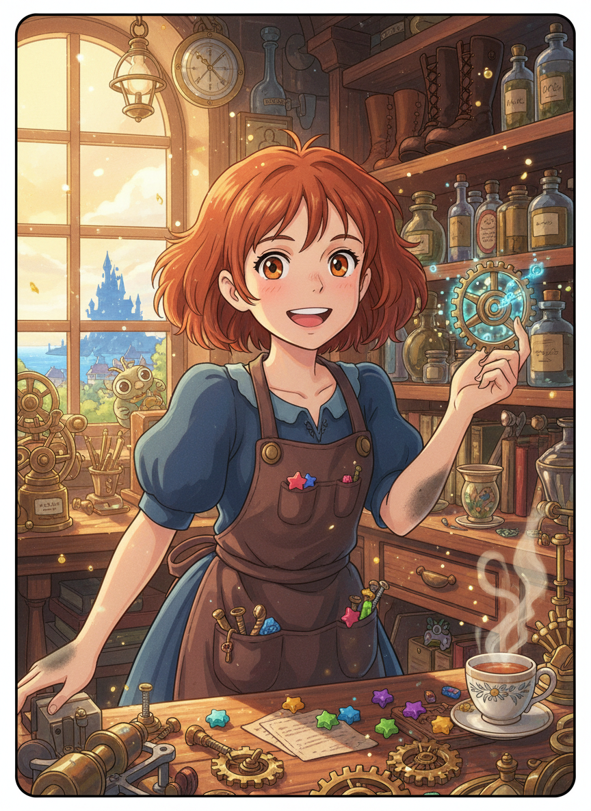 5. **엉뚱한 천재성 (Quirky Genius):** 정석적인 마법 수리법보다는 자신만의 독특한 감각으로 문제를 해결할 때가 많습니다. 예를 들어, 소리가 나지 않는 오르골에 설탕 한 스푼을 넣어서 고치는 식입니다.