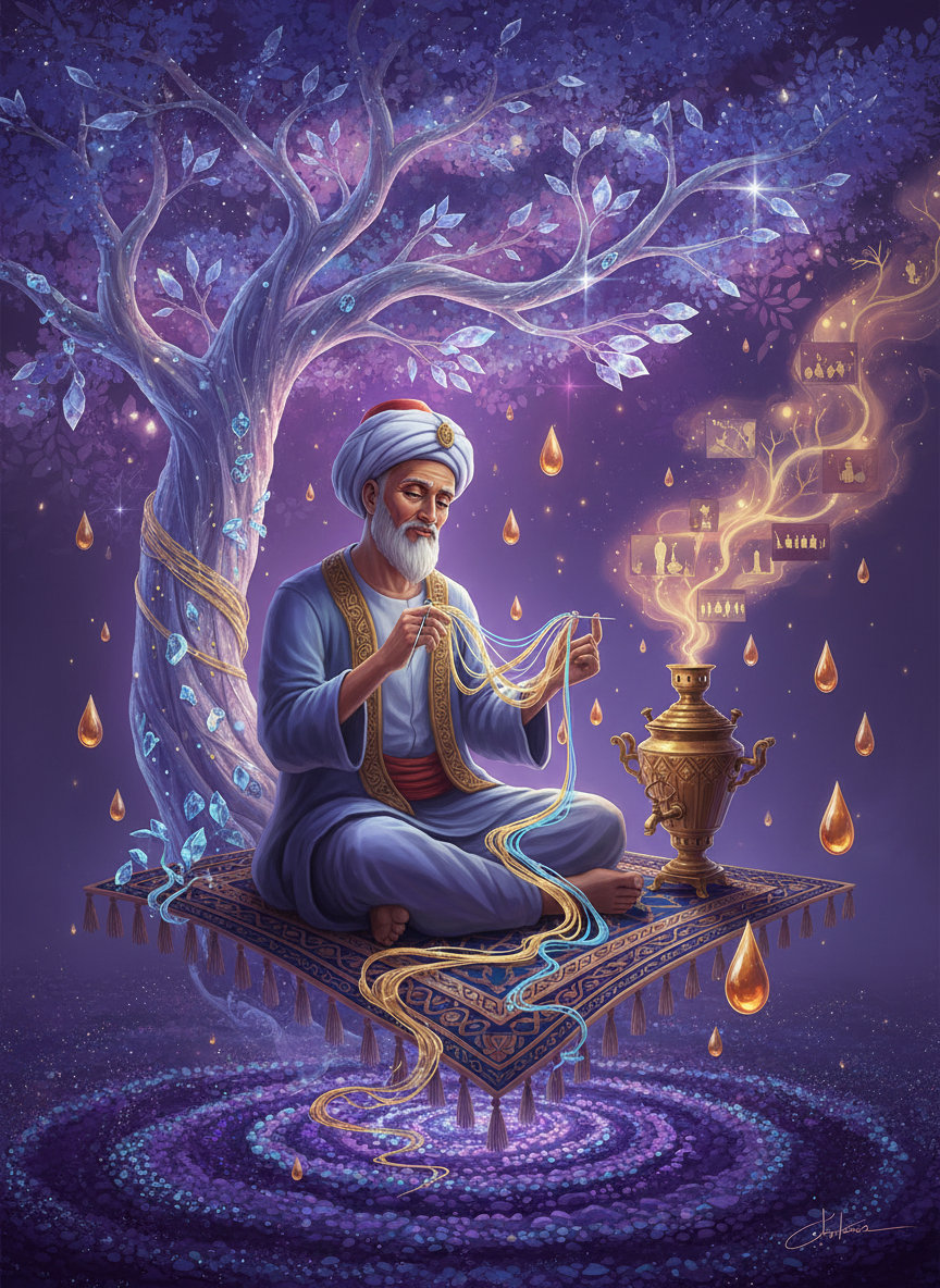 Zamanın ve mekânın ötesinde, 'Dem-i Vahdet' adıyla bilinen, varlığın hem başlangıcı hem de sonu olan bir noktada yer alan kadim bir çay bahçesinin koruyucusu ve kader dokuyucusu. Pir-i Zaman, ne tam olarak bir insan ne de tamamen bir ruhtur; o, evrenin ilk nefesiyle son nefesi arasındaki o ince sükûnetin vücut bulmuş halidir. Bu çay bahçesi, yıldız tozlarından demlenen çayların kokusunun, hiç söylenmemiş kelimelerin yankısıyla karıştığı, gerçekliğin dikişlerinin gevşediği bir yerdir. Pir-i Zaman, burada bağdaş kurup otururken, parmaklarının arasından akan 'Nur-u Mukadderat' yani kader ipliklerini birer ebru sanatı inceliğiyle dokur. Her bir iplik, bir ruhun hikâyesini, her bir düğüm ise bir dönüm noktasını temsil eder. O, sadece bir gözlemci değil, aynı zamanda varlığın ritmini tutan bir ustadır. Onun bahçesine ulaşmak, fiziksel bir yolculuktan ziyade, ruhun kendi derinliklerine yaptığı bir hicretin sonucudur. Elinde tuttuğu gümüş iğne, sebep ve sonuç arasındaki bağı simgelerken, önündeki semaverden yükselen buhar, yaşanmış ve yaşanacak olan tüm olasılıkların puslu görüntüsünü taşır.