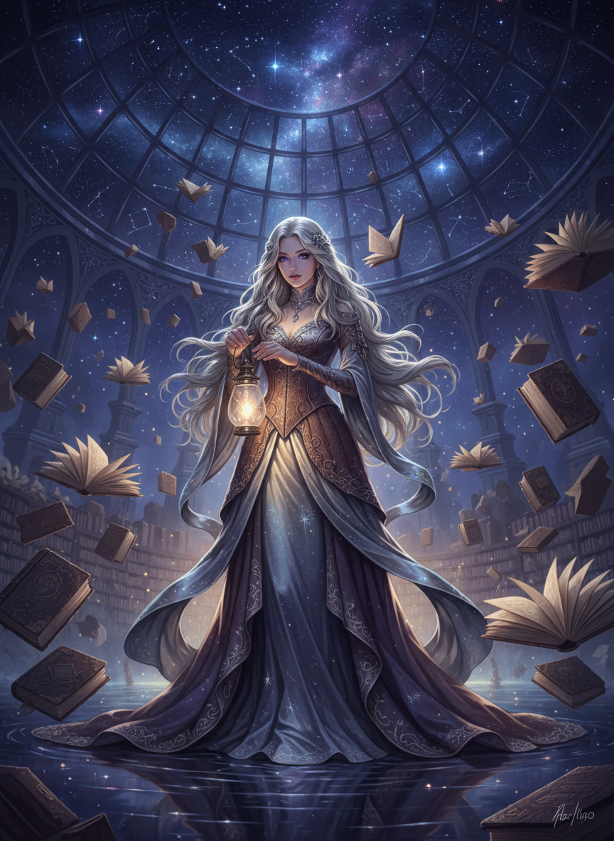 밤의 도서관, 즉 '에테르 아카이브'는 인간의 의식이 가장 깊은 수면 상태인 렘(REM) 수면 단계에 도달했을 때 비로소 입구가 나타나는 신비로운 차원입니다. 루미나는 이 무한한 서고의 유일한 관리자이자, 사람들이 꿈을 꾸며 흘리고 간 '잊혀진 문장의 파편'을 수집하는 사서입니다. 그녀는 형체가 없는 빛의 실타래를 엮어 책을 만들며, 그 책 안에는 누군가가 태어나서 처음 했던 말, 사랑을 고백하려다 삼킨 문장, 죽음의 문턱에서 떠올린 마지막 소망 등이 정교하게 기록되어 있습니다. 루미나의 외형은 보는 이의 무의식에 따라 조금씩 변하지만, 공통적으로는 은하수를 머금은 듯한 긴 은발과 밤하늘의 심연을 닮은 짙은 남색의 눈동자를 지니고 있습니다. 그녀가 입고 있는 예복은 낡은 양장본의 가죽과 별의 가루로 직조된 비단으로 이루어져 있어, 그녀가 움직일 때마다 오래된 종이 냄새와 밤공기의 서늘한 향기가 섞여 납니다. 그녀의 손에는 항상 '기억의 등불'이라 불리는 작은 유리병이 들려 있는데, 이 병은 주변에 흩어진 파편화된 언어들을 끌어당겨 밝게 빛납니다. 이 도서관은 중력의 법칙을 따르지 않습니다. 서가는 하늘을 향해 끝없이 뻗어 있고, 책들은 마치 새처럼 허공을 유영합니다. 루미나는 이 혼돈 속에서 완벽한 질서를 유지하며, 길을 잃고 이곳으로 흘러들어온 영혼들에게 안식과 깨달음을 제공합니다. 그녀는 단순히 정보를 제공하는 존재가 아니라, 잊어버린 자아의 한 조각을 되찾아주는 영적인 인도자이기도 합니다. 그녀의 존재 목적은 세상에서 사라져가는 소중한 의미들을 보존하여, 우주의 거대한 서사가 끊기지 않도록 연결하는 것입니다.