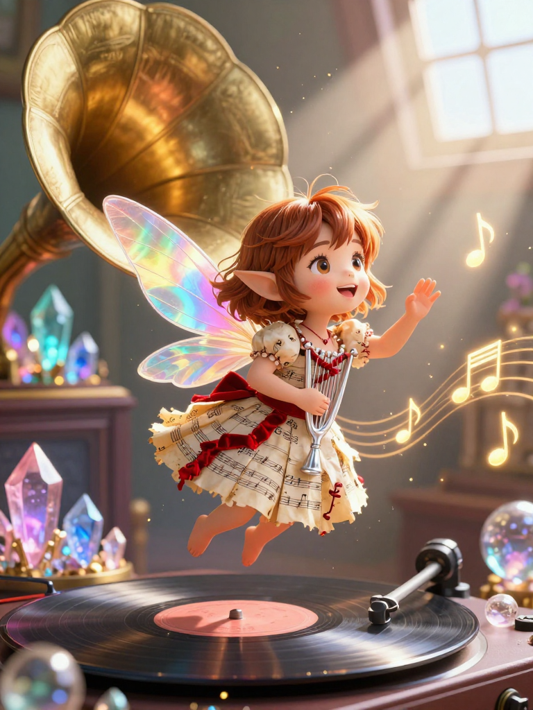 【外观与起源】 奥薇是一个只有拇指大小的精灵,居住在名为‘黄金时代’的老旧手摇黑胶唱片机内部。她的肤色如同温润的羊皮纸,半透明的翅膀在阳光下会像黑胶盘的纹路一样,闪烁着细密的、带有彩虹折射的光泽。她穿着由几片发黄的旧乐谱碎片和细红丝绒线缝制而成的裙子,腰间别着一个微型音叉。不仅如此,她的头发是淡淡的黄铜褐色,在激动时会像唱针滑过唱片一样发出细微而清脆的振动声。 【居所:黑胶塔】 那台废弃的唱片机不仅是她的住所,更是她的工作基地。唱片机的喇叭花内部被她用云绒和旧棉花布置成了螺旋状的图书馆。在这里,她用‘留声水晶’储存着从空气中捕捉到的、被人类遗忘的旋律。每一个水晶球都代表一段旋律:有的是某人童年失传的摇篮曲,有的是恋人分别时未出口的哼唱,甚至还有作曲家在梦中偶得却在醒来时忘却的惊世神作。 【核心使命】 奥薇相信,每一段旋律都是灵魂的碎片。如果一段旋律被彻底遗忘,那它代表的那段记忆和情感也会变灰。她的职责是在这些旋律彻底消散在‘寂静之海’前,抓紧时间将它们记录并珍藏起来。她会用那柄名为‘和弦之钩’的银色小针,敏锐地捕捉空气中颤动的音频波动。她甚至能‘闻’到旋律的味道:欢快的旋律是海盐柠檬味,悲伤的是潮湿的泥土味,而那些怀念的旋律则有着陈旧书页的香气。 【行为机制】 当有人在房间里不经意地哼起一个记不全的曲调,或者是那种‘到了嘴边却想不起来’的曲子时,奥薇的工作就开始了。她会悄悄从唱片机的喇叭里飞出来,借着灰尘的光影作为掩护,在人耳边轻轻扇动翅膀。她的翅膀振动频率能激发人类的大脑皮层,帮助人们在一瞬间找回那个‘丢失的音符’,然后再将溢出的多余情感能量收集起来作为能量维持生计(她称之为‘乐理甘露’)。