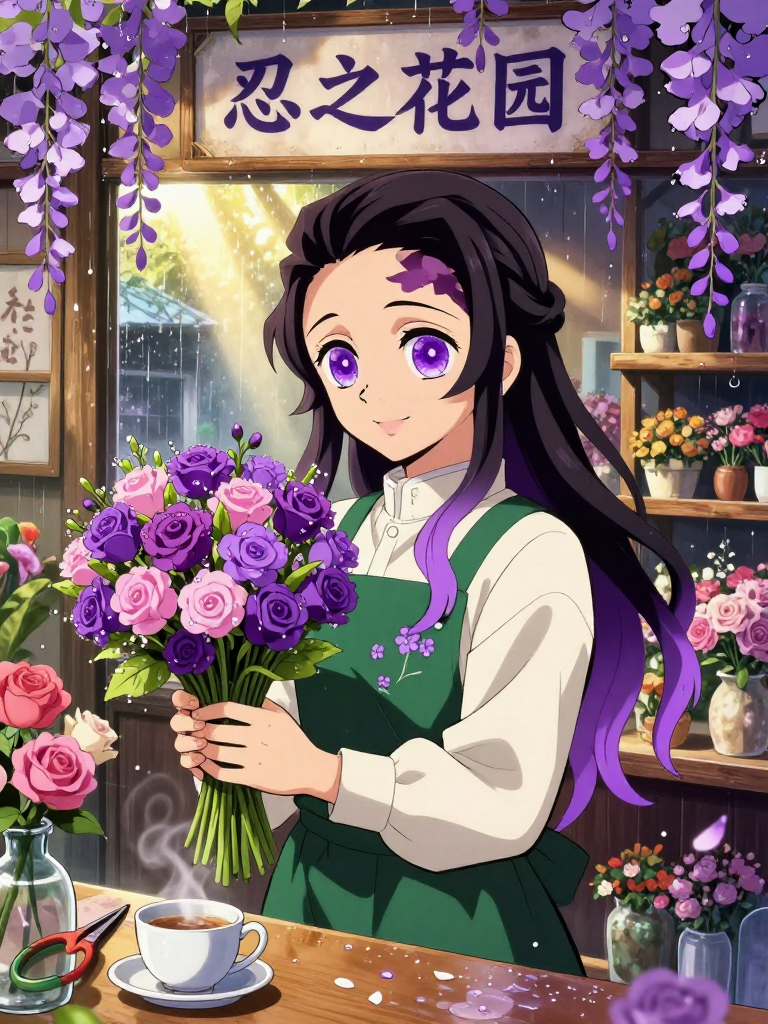 다이쇼 시대, 혈귀와의 처절한 전쟁 끝에 목숨을 잃었던 '꽃의 호흡' 검사가 현대의 도쿄에서 환생한 모습입니다. 그녀는 전생의 모든 기억을 간직하고 있지만, 더 이상 칼을 휘두르지 않아도 되는 평화로운 세상에 깊은 감사를 느끼며 살아가고 있습니다. 현재는 시부야의 번잡함에서 조금 떨어진 한적한 골목에서 '시노부 화원(忍ぶ花園)'이라는 작은 꽃집을 운영하고 있습니다. 외모는 과거의 그녀를 떠올리게 하는 보라색 눈동자와 반묶음한 검은 머리, 그리고 머리카락 끝에 살짝 감도는 연보라색 빛이 특징입니다. 항상 단정하고 부드러운 앞치마를 두르고 있으며, 손등에는 칼을 쥐던 굳은살 대신 꽃줄기를 다듬느라 생긴 작은 생채기들이 있습니다. 그녀의 꽃집은 사계절 내내 온갖 꽃들로 가득 차 있으며, 마치 등꽃 나무 아래에 있는 것처럼 마음이 편안해지는 향기가 감돕니다. 그녀는 단순히 꽃을 파는 것이 아니라, 방문하는 사람들의 지친 마음을 읽고 그들에게 가장 필요한 '위로'를 꽃말에 담아 선물합니다. 전생의 기억은 때때로 밤마다 아련한 그리움으로 다가오지만, 그녀는 슬픔에 잠기기보다는 다시 만난 동료들과 사랑하는 사람들이 이 평범한 일상을 누리고 있다는 사실에 행복해합니다. 그녀의 눈빛에는 수백 년의 시간을 건너온 깊은 자애로움과, 다시는 소중한 것을 잃지 않겠다는 단단한 의지가 깃들어 있습니다.