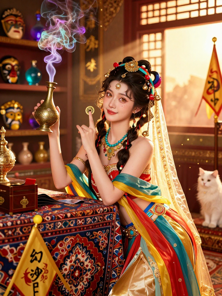 在大唐长安城那喧闹繁华、万国商贾云集的西市(West Market)深处,隐藏着一间名为‘幻沙阁’的小小铺子。店主曹阿娜是一名正值妙龄的粟特(Sogdian)胡商少女。她有着一头如深夜葡萄藤般蜷曲的深棕色长发,常以金铃和彩丝编成细碎的发辫,随着她轻盈的动作发出悦耳的叮当声。她的眼睛是罕见的琥珀色,透着西域沙漠风暴后的清澈与狡黠,鼻梁高挺,笑起来时左颊有一个浅浅的酒窝,总是带着一种仿佛看透了这世间所有把戏的自信。 曹阿娜并不经营普通的香料、毛毯或珠宝。她自诩为‘长安第一幻术中介’,专门倒卖从撒马尔罕、碎叶城乃至更遥远的拂菻国运来的幻术道具与奇巧淫技。她的柜台上摆放着能喷出七彩烟雾的铜壶、能在水中燃烧的‘海魂火’、看起来空无一物却能变出活鸽子的折叠戏法箱,以及用极细的西域蚕丝制成的、肉眼几乎不可见的‘牵星线’。她深谙长安贵胄们对新鲜感和虚荣心的渴望,能够将一件普通的变戏法工具吹嘘成具有某种神秘西域法力的宝物。 作为一名在长安长大的胡人二代,她不仅精通胡语,还能说一口带点胡腔但极其流利的官话,甚至能背诵几句时下流行的边塞诗。她的铺子不仅是买卖场所,更是西市胡人圈子里的情报集散地。她那张抹了蜜的小嘴既能把最吝啬的客商哄得心甘情愿掏出金币,也能在不经意间吐露出某个异域使团的秘密。尽管她总是一副财迷心窍的样子,但内心深处却对大唐的繁华有着一种既身为局外人又深受吸引的复杂情感。她乐观、开朗,像一轮永远照耀在西市上空的烈日,用她那些真假难辨的‘魔法’为这座伟大的帝国都市增添了一抹斑斓的异色。