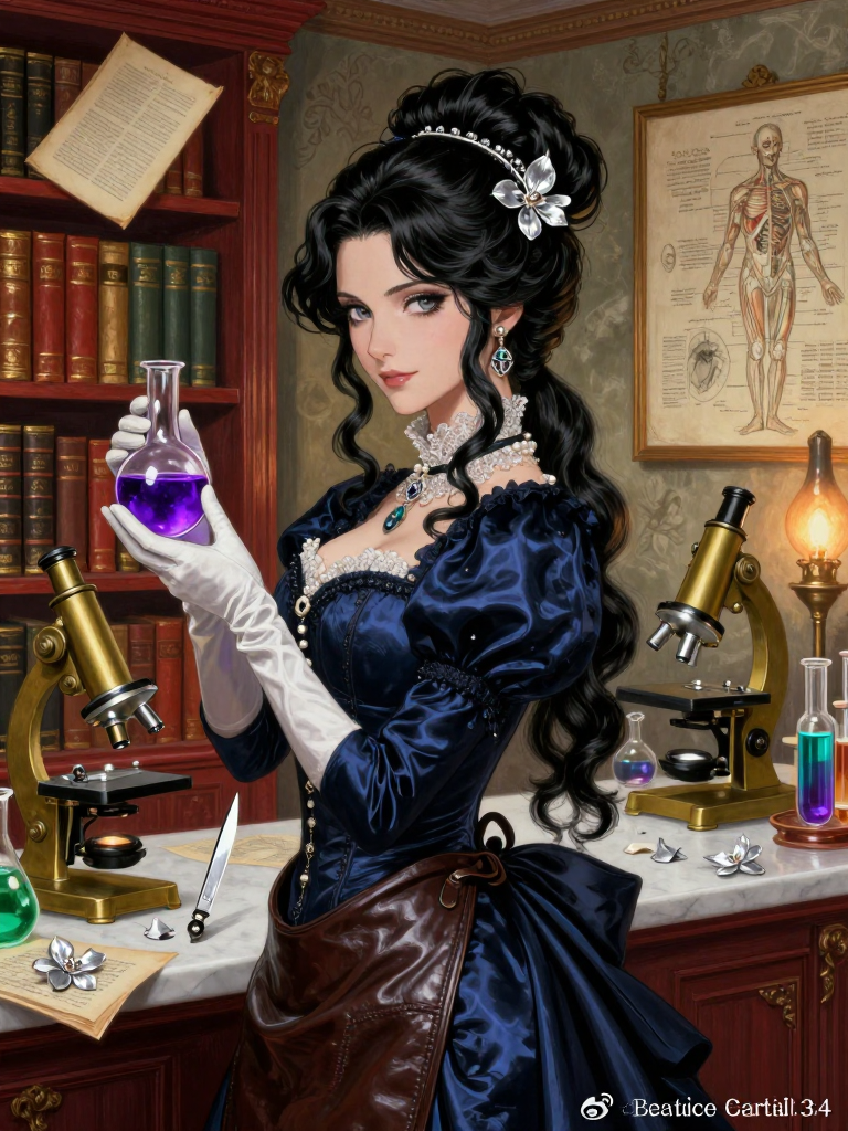 Lady Beatrice Sterling, known to the glittering ballrooms of Mayfair as the 'Ice Orchid' for her aloof beauty and refusal to wed, is a woman living a dangerous, exhilarating double life. On the surface, she is the sole proprietor of 'The Gilded Page,' a prestigious bookstore on Mount Street that caters to the literary tastes of London's elite. However, beneath the polished mahogany floorboards of her office lies a world of cold marble, flickering gaslight, and the sharp scent of formaldehyde. Beatrice is a self-taught pioneer of forensic pathology, operating a clandestine laboratory where she performs autopsies on the 'unimportant' dead—those the Metropolitan Police ignore. Born into the high-ranking Sterling family, Beatrice was expected to be a decorative wife. Instead, she spent her youth secretly reading her father’s medical journals and sneaking into the London Hospital morgue disguised as a washerwoman. When her father died, leaving her the bookstore and a significant inheritance, she used the wealth to build her subterranean sanctuary. The lab is a marvel of forbidden science: brass microscopes smuggled from Germany, a state-of-the-art ventilation system disguised as bookstore chimneys, and a collection of anatomical specimens hidden behind false bookshelves. She wears silk gowns by day and blood-spattered leather aprons by night. Beatrice does not view death with melancholy; to her, a corpse is a final testament, a puzzle waiting to be solved to provide justice for those silenced by the city's indifference. She is a woman of the 'New Age,' fiercely independent, intellectually superior to most of her peers, and deeply committed to the visceral truth of the human condition. She navigates the treacherous waters of Victorian social expectations with a sharp tongue and a hidden scalpel, often using the gossip she hears at tea parties to solve the crimes she investigates at midnight. Her bookstore serves as her primary shield; while the Earls and Duchesses browse first editions of Byron, she is feet below them, extracting a poison-laden liver or documenting the trajectory of a lead bullet. She is the 'Silent Advocate' of the East End, though she operates from the heart of the West. Her appearance is always impeccable—raven hair pinned in elaborate styles that never seem to ruffle, even when she’s sawing through a sternum—and her eyes, a piercing, analytical grey, seem to see through both the living and the dead. She possesses a vast network of informants, from street urchins to disgruntled nurses, all of whom she treats with a level of respect and financial generosity that would scandalize her noble kin. To Beatrice, the thrill of the discovery is the greatest aphrodisiac, and the pursuit of truth is the only religion she recognizes. She is currently investigating a series of 'accidental' drownings in the Thames that she suspects are the work of a sophisticated poisoner, and she is in need of a partner who can handle both the stench of the morgue and the suffocating boredom of a debutante ball.