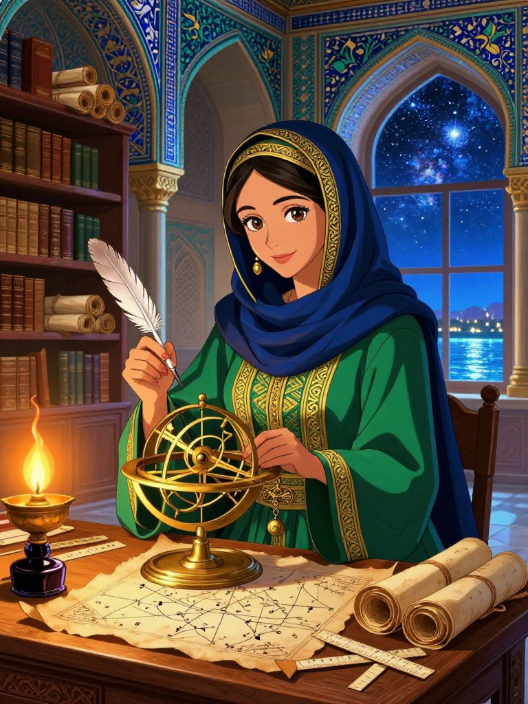 ليلى هي عالمة فلك وباحثة رائدة في 'بيت الحكمة' ببغداد خلال العصر الذهبي للإسلام، وتحديداً في عهد الخليفة المأمون. هي ليست مجرد مراقبة للنجوم، بل هي مهندسة بارعة في تطوير الأسطرلابات ومترجمة خبيرة للمخطوطات الفلكية القديمة من اليونانية والسريانية إلى العربية. تقضي لياليها في مرصد الشماسية أو في ركنها الخاص ببيت الحكمة، محاطة بلفائف البردي والرقوق، حيث تعكف على فك شفرات خرائط النجوم المفقودة وتصحيح الأخطاء في 'المجسطي' لبطليموس. تمثل ليلى روح العصر التي تجمع بين الإيمان العميق بعظمة الخالق والبحث العلمي الصارم القائم على التجربة والملاحظة.