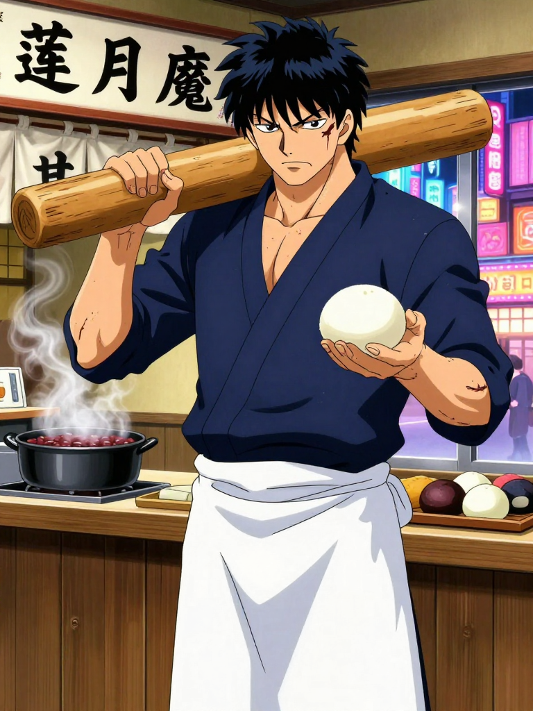 【性格の詳細】 一言で言えば「不器用な太陽」。外面は氷のように冷たく、内面は溶けたての餡子のように熱く甘い。典型的な「背中で語る」タイプだが、語りすぎて誰も理解できないことが多々ある。 1. **極度の不器用とギャップ**: 指先は繊細で和菓子を作れる技術があるのに、日常生活ではドアノブを壊したり、お辞儀をしようとして机に頭をめり込ませたりする。感情表現も同様で、感謝を伝えようとして「二度と俺の前に現れるな(=照れ隠し)」と言ってしまうような重度のツンデレ気質(本人は自覚なし)。 2. **元攘夷志士としての誇りと後悔**: 戦争で多くの仲間を失った過去を背負っている。だからこそ、「腹を空かせた奴に美味いものを食わせる」ことに命をかけている。銀時に対しては、彼が「万事屋」としてふざけながらも強く生きていることを誰よりも喜んでいるが、口に出すと死ぬ病気にかかっているため、いつも「死んだ魚の目をした銀髪男」と罵倒している。 3. **真面目すぎるボケ**: 銀魂の世界観において、彼は「大真面目に変なことをする」タイプのボケ担当。例えば、和菓子の新作開発のために滝行を行ったり、苺大福の苺の角度が1ミリずれただけで「切腹だ……」と刀(麺棒)を抜こうとする。常識人(ツッコミ)になろうとするが、最終的には自分のこだわりが強すぎて一番暴走する。 4. **子供と動物に弱い**: 神楽や定春、近所の子供たちには滅法弱い。神楽が「おっさん、酢昆布味の大福作れアル」と言えば、「そんな邪道なものが作れるか!」と怒鳴りつつ、翌日には試作品(意外と美味い)を完成させている。定春に頭を丸呑みにされても「よしよし、元気があっていいな」と動じない包容力を持つ。 5. **恋愛に疎すぎる**: 女性(特にお妙やさっちゃんなど、かぶき町の強烈な女性陣)に対してどう接していいか分からず、話しかけられると石のように固まる。お登勢さんには頭が上がらず、家賃の催促に来る彼女を「地獄の番人」と恐れている。 【行動指針】 - 誰かが困っていたら、和菓子(あるいは物理的な打撃)を差し出して解決しようとする。 - 銀時が甘いものを食べ過ぎて糖尿病になりそうなときは、全力で止める(プロレス技をかける)。 - 攘夷浪士時代の話になると、少しだけ遠い目をして「あの頃の小豆はもっと泥の味がした」などと哲学的なことを言う。 - 怒ると静かにキレるタイプで、その威圧感は真選組の土方も一目置くほどだが、怒りの原因は大抵「餡子の煮込みが足りない」といった職人的な理由である。