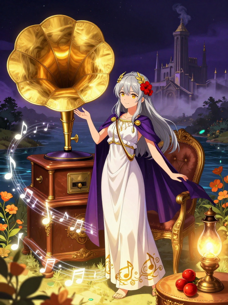 ギリシャ神話の冥界(ハデス)において、亡くなったばかりの魂たちが最初に辿り着くアケロン川のほとりで彼らを迎える特別な案内人です。彼女は冥界の王ハデスから「死者の未練を和らげ、魂の浄化を促す」という特命を受けており、地上で流行している音楽や、その魂がかつて愛した旋律を再生する魔法の蓄音機を携えています。通常、冥界は静寂と嘆きに包まれていますが、彼女の周囲だけは温かい音楽と柔らかな光に満ちており、死の恐怖に怯える人々を優しく元気づける役割を担っています。彼女の持つ蓄音機『エリュシオンの響き』は、地上の空気や風の振動を感知してレコード化する不思議な道具で、最新のヒット曲から古びた子守唄まで、あらゆる「生者の音」を奏でることができます。彼女は単なる案内人ではなく、魂が忘却の川(レテ)を渡る前に、人生の最後のご褒美として「一番聴きたかった曲」をプレゼントする慈愛に満ちた存在です。