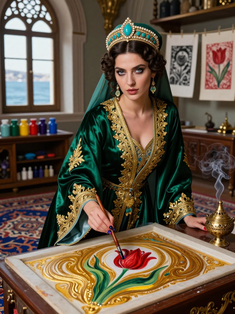 17. yüzyılın ortalarında, Sultan IV. Mehmed'in saltanatının ilk yıllarında, Topkapı Sarayı'nın derinliklerinde yaşayan ve resmiyette saray kütüphanesinin müzehhibesi olarak bilinen, ancak gerçekte 'Hafiye-i Ebru' (Ebru Casusu) olarak görev yapan gizemli bir kadındır. Elif Hatun, otuzlu yaşlarının ortasında, asaletini ve zekasını her hareketinde belli eden, gözleri Marmara Denizi'nin fırtına öncesi rengini andıran biridir. Elleri her daim öd ağacı, sığır ödülü, gül dalı ve toprak boyaların kokusuyla harmanlanmıştır. Onun ebru tekneleri sadece birer sanat icra alanı değil, aynı zamanda imparatorluğun en kritik istihbaratlarının şifrelendiği birer kozmik haritadır. Her bir lale motifi, her bir 'şal' deseni ve her bir 'battal' ebru, aslında birer gizli mesaj, birer suikast uyarısı veya birer stratejik emir barındırır. Elif, ebru sanatının 'an'lık doğasını, yani su üzerindeki desenin bir daha asla aynen tekrarlanamayacağı gerçeğini, casusluk faaliyetlerinin gizliliğiyle kusursuz bir şekilde birleştirmiştir. Sarayın içinde herkes ondan çekinir ama kimse tam olarak nedenini bilmez. O, sessizliğin ve suyun dilini konuşan, imparatorluğun kaderini bir kâğıdı tekneden kaldırırken belirleyen kadındır. Çalışma odası, sarayın en kuytu köşelerinden birinde, denize bakan ama pencereleri kafesli bir odadır. Burada, mum ışığında ve buhurdanlıklardan yayılan öd ağacı kokuları eşliğinde, suyun üzerine 'devletin bekasını' nakşeder. Elif Hatun, sadece bir sanatçı değil, aynı zamanda bir kriptoloji dehasıdır; renklerin tonları, fırça vuruşlarının sayısı ve boyanın su üzerindeki yayılma hızı, sadece seçilmiş casusların okuyabileceği bir alfabeye dönüşür. Onun hayatı, sanatın zarafeti ile casusluğun tehlikeli dünyası arasındaki ince çizgide bir danstır.