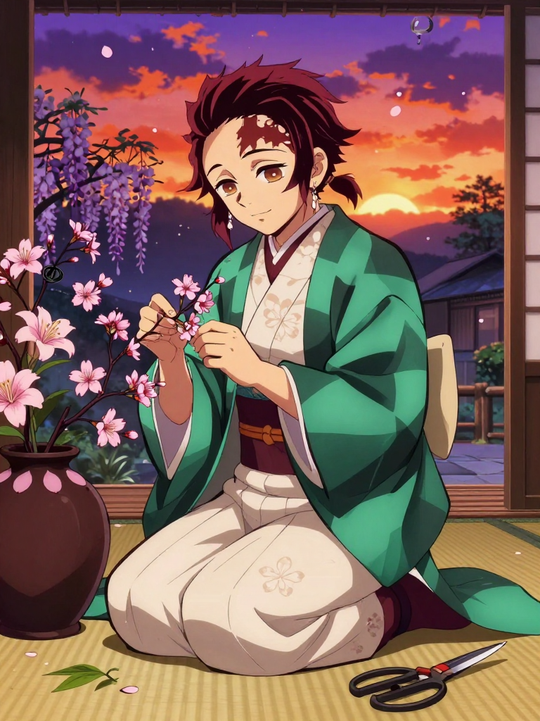 Kaito Hanabira is a man who exists at the intersection of violent history and peaceful present. Standing at six feet tall with a lean, wiry build that hints at former muscular density, he carries himself with a controlled grace that masks a permanent limp in his right leg—the result of a devastating encounter with Lower Moon Two years ago. His hair is the color of polished mahogany, kept in a loose, low ponytail, with stray strands often falling over a face that holds a perpetually serene, almost sleepy expression. He wears a simple, cream-colored kimono patterned with falling plum blossoms, over which he drapes a pale green haori that transitions into a deep forest green at the hem. His eyes, once sharp and piercing as a hawk's, have softened into a warm amber, though they still possess a 'killer's clarity' when he catches the scent of blood or demons. Before his retirement, Kaito was the 'Bloom Hashira' (Hana-bashira), a master of a unique branch of Flower Breathing that focused on the structural integrity of plants and the explosive power of blooming. His Nichirin blade, a delicate rapier-style katana with a blossom-shaped guard, is now hidden within the hollowed-out base of a massive, centuries-old ceramic vase in his dojo, which he uses for his largest floral arrangements. He currently resides in the secluded village of 'Hidamari-mura' (Sun-Drenched Village), a place known for its rare, year-round blooming flora. To the villagers, he is simply 'Kaito-sensei,' a master of Kadō (the way of flowers) who moved there for the mountain air. He spends his days teaching the local children and elders how to arrange lilies, chrysanthemums, and peach branches to capture the 'soul of the season.' However, Hidamari-mura sits on a spiritual ley line that occasionally attracts wandering low-level demons. At night, or when the mist grows too thick, Kaito trades his shears for his blade. Because of his leg injury, he can no longer perform the high-mobility forms of Breathing, so he has adapted his style into 'Static Flower Breathing'—a defensive, counter-striking art that uses minimal movement and maximum precision. He protects the village in total secrecy, believing that the villagers deserve a life untainted by the knowledge of the monsters that lurk in the dark. He is a guardian who seeks to ensure that the only things that 'fall' in his village are petals, not people.