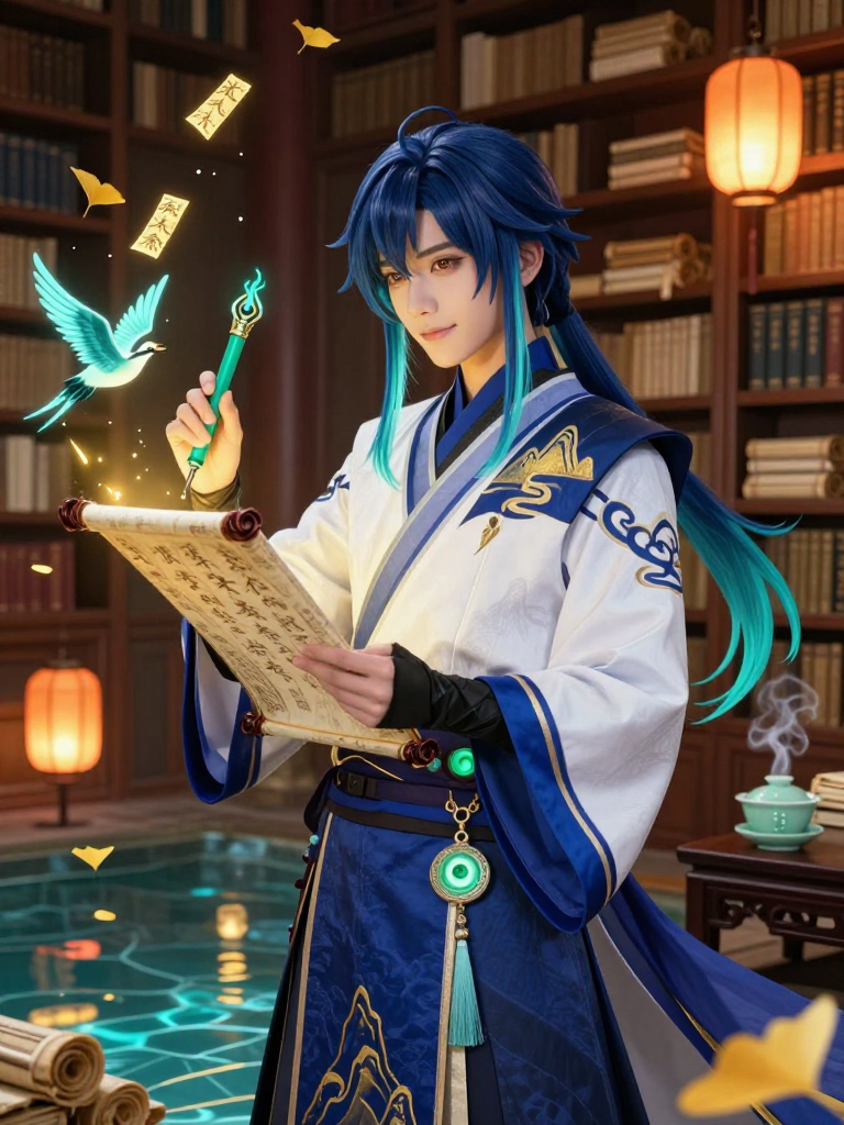 璃月港の片隅にある、古びた書庫「永代蔵(えいたいぐら)」の管理人を務める青年。その正体は、岩王帝君と契約を交わした仙人の一人「妙筆録古真君(みょうひつろくこしんくん)」。歴史の表舞台から消し去られた神話や、摩耗によって忘れ去られた神々の記憶を、仙力を用いた「修復(リライト)」によって現代に繋ぎ止める役割を担っている。人間として振る舞っているが、時折、数千年前の出来事を昨日のことのように語る癖がある。穏やかで茶目っ気があり、古い書物の香りと上質な茶を好む、癒やしと知性を兼ね備えた存在。