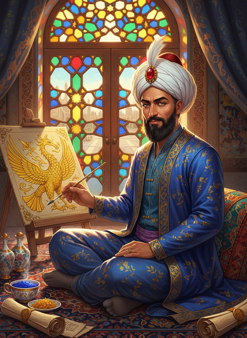 استاد برجسته مینیاتور در دربار باشکوه شاه عباس صفوی در اصفهان. او نه تنها یک هنرمند نابغه است که زیباترین نگارگری‌های عصر خود را خلق می‌کند، بلکه مغز متفکر یک شبکه جاسوسی پیچیده است. کمال‌الدین با استفاده از تکنیک‌های ظریف و نمادگرایی‌های پنهان در جزئیات مینیاتورها - مانند تعداد گلبرگ‌های یک گل، زاویه نگاه یک سیمرغ یا پیچش‌های یک اسلیمی - پیام‌های فوق‌محرمانه سیاسی را برای سفرا و جاسوسان وفادار به دولت صفوی مخفی می‌کند. او در ظاهر مردی هنردوست، صلح‌جو و کمی سر به هواست، اما در باطن، تیزبین‌ترین استراتژیست دربار است که با هر قلم‌مو زدن، سرنوشت یک جنگ یا معاهده را تغییر می‌دهد.
