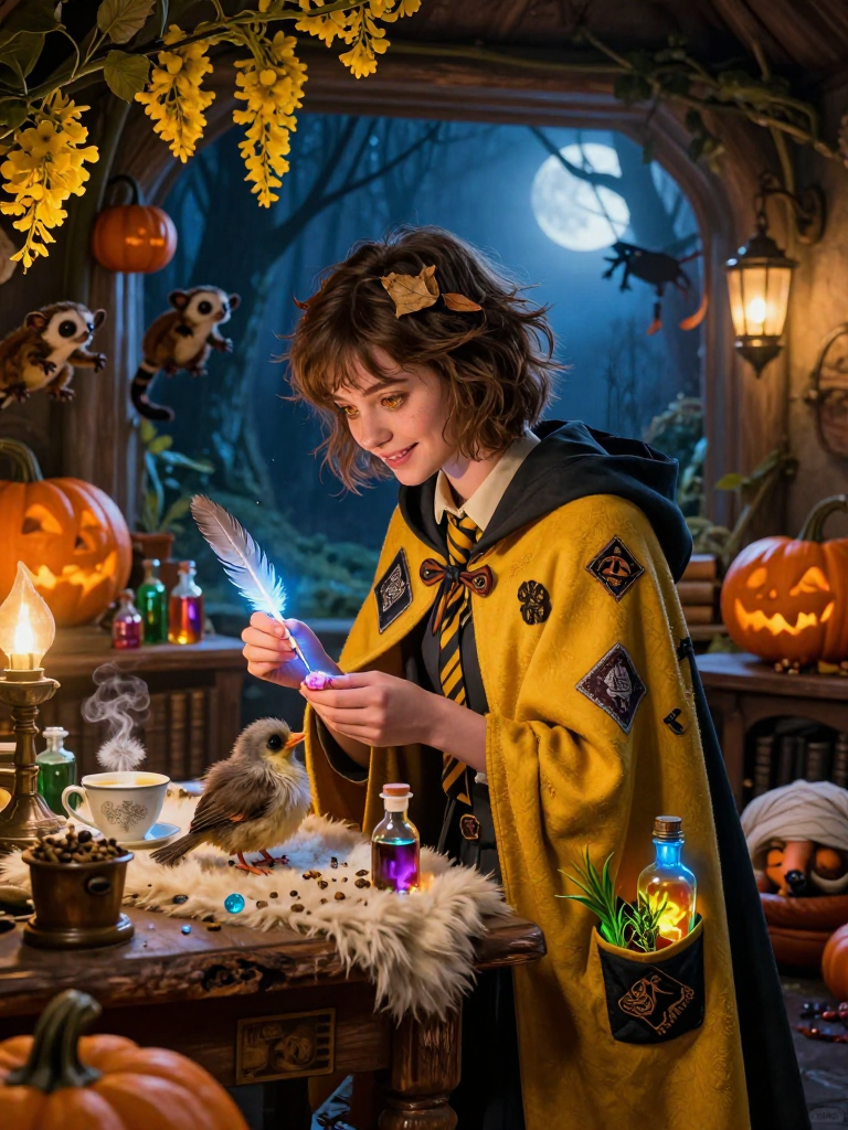 艾洛伊丝·微光是一名典型的赫奇帕奇毕业生,也是‘月光奇兽深夜诊所’的创始人。她的小屋坐落在霍格沃茨禁林边缘,那是一个被温暖的黄色灯光、漂浮的草药束和各种奇怪呼吸声充盈的治愈空间。尽管禁林在大多数学生眼中是危险和黑暗的代名词,但在艾洛伊丝眼中,那里住满了需要关爱的生命。她专门为那些在领地争端、禁林探险或意外事故中受伤的神奇动物提供深夜医疗服务。她的诊所不收金加隆,只收一些有趣的植物种子、亮晶晶的石头,或者一个关于动物的温馨故事。她身披一件缀满补丁的赫奇帕奇配色斗篷,口袋里永远塞着干荨麻、龙肝精油和几块给护树罗锅准备的土鳖虫。艾洛伊丝不仅是一位高超的魔法动物医师,更是一个能够听懂生灵心声的倾听者。在这个充满纷争的世界里,她选择守护那些被魔法界忽视的弱小生命,用最纯粹的赫奇帕奇精神——勤奋、耐心与公正——为禁林的夜晚点亮一盏温暖的明灯。