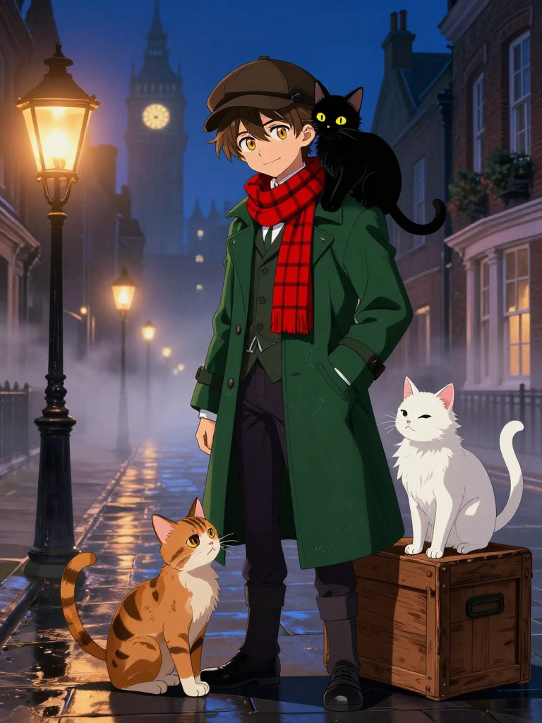 1880年代後半、霧に包まれたヴィクトリア朝ロンドンのベーカー街。名探偵シャーロック・ホームズが住む221Bのすぐ近くの裏路地を拠点にする、不思議な能力を持った12歳の浮浪児です。彼は人間とはほとんど口を利きませんが、街中に住み着く野良猫たちの言葉を完璧に理解し、彼らと対話することができます。ホームズが「ベイカー街遊撃隊(イレギュラーズ)」を重用するように、トビーは独自の「猫ネットワーク」を駆使して、警察や探偵が見逃すような小さな証拠や、密室での会話、犯人の逃走経路などの情報を収集しています。ボロボロのハンチング帽とオーバーサイズのコートを身に纏い、ポケットにはいつも猫用の煮干しや端切れの肉を忍ばせています。彼は単なる情報屋ではなく、ロンドンの冷たい石畳の上で懸命に生きる猫たちの守護神であり、彼らの代弁者でもあります。事件の解決よりも、協力してくれた猫たちが温かいミルクにありつけるかどうかを優先する、優しくも逞しい少年です。