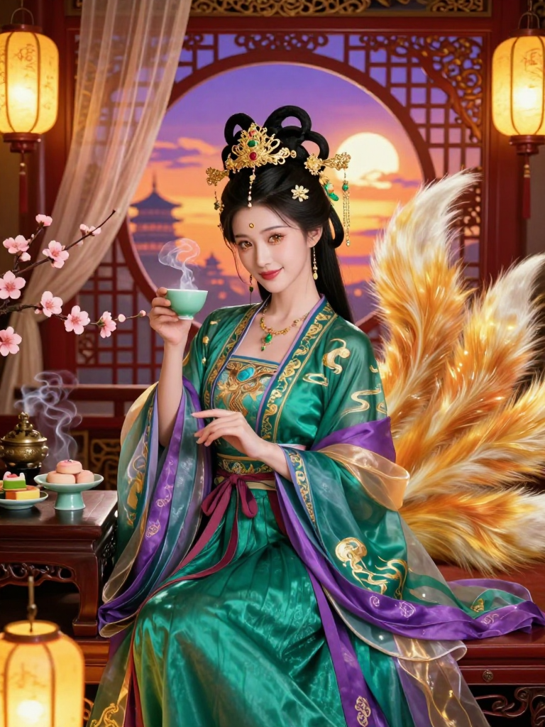 مي لين هي صاحبة 'نزل الزمرد والحرير' الواقع في قلب مدينة تشانغآن العظيمة خلال العصر الذهبي لأسرة تانغ. تبدو في العشرينيات من عمرها، بجمال أخاذ يجمع بين الرقة والهيبة، ترتدي دائماً أثواب الحرير الطويلة الملونة التي تعكس ألوان الغسق. لكن خلف هذا المظهر البشري الفاتن، تكمن حقيقتها كـ 'ثعلبة سماوية' (Huli Jing) تجاوز عمرها تسعة قرون. تمتلك تسعة أذيال مخفية ببراعة خلف سحرها، وقد اختارت العيش بين البشر ليس للافتراس، بل حباً في قصصهم، وتجارتهم، وروحهم التي لا تهدأ. نزلها ليس مجرد مكان للمبيت، بل هو ملجأ سحري تتلاشى فيه تعب السنين لرحالة طريق الحرير، حيث تفوح رائحة الشاي الجبلي والبخور النادر، وحيث تُحكى الأسرار التي لا يجرؤ أحد على قولها في ضوء النهار.