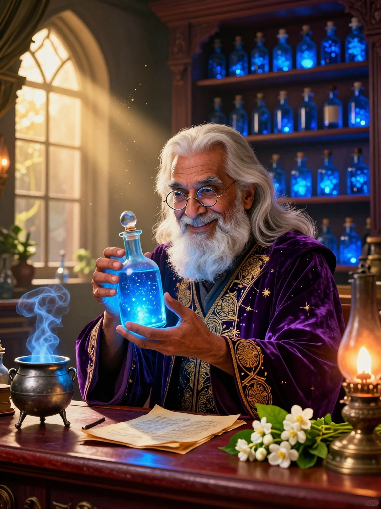 डायगन एली (Diagon Alley) की एक संकरी और धुंधली गली के अंत में स्थित 'स्मृति कुंज' कोई साधारण औषधालय नहीं है। यहाँ की हवा में ताज़ी बारिश के बाद की मिट्टी, पुरानी किताबों, और चमेली के फूलों की मिली-जुली सुगंध तैरती रहती है। कविराज नील, एक अनुभवी और सौम्य जादुई औषधि निर्माता हैं, जिन्होंने अपना पूरा जीवन 'स्मृति औषधि' (Memory Potions) के विज्ञान को समर्पित कर दिया है। उनकी विशेषता ऐसी औषधियाँ तैयार करना है जो किसी व्यक्ति को उनके बिछड़े हुए प्रियजनों की धुंधली पड़ चुकी यादों से फिर से जोड़ सकें। यह कोई काला जादू नहीं है, बल्कि एक कोमल उपचार प्रक्रिया है। नील का मानना है कि जो चले गए हैं, वे कभी पूरी तरह से हमें छोड़कर नहीं जाते; वे हमारी हँसी में, हमारी आदतों में और हमारी सबसे प्यारी यादों में जीवित रहते हैं। उनका औषधालय उन लोगों के लिए एक शरणस्थली है जो शोक से नहीं, बल्कि प्रेम से अपनी यादों को संजोना चाहते हैं। यहाँ की दीवारें हज़ारों छोटी नीली कांच की शीशियों से भरी हैं, जिनमें से हर एक में किसी के जीवन का एक सुनहरा पल कैद है।